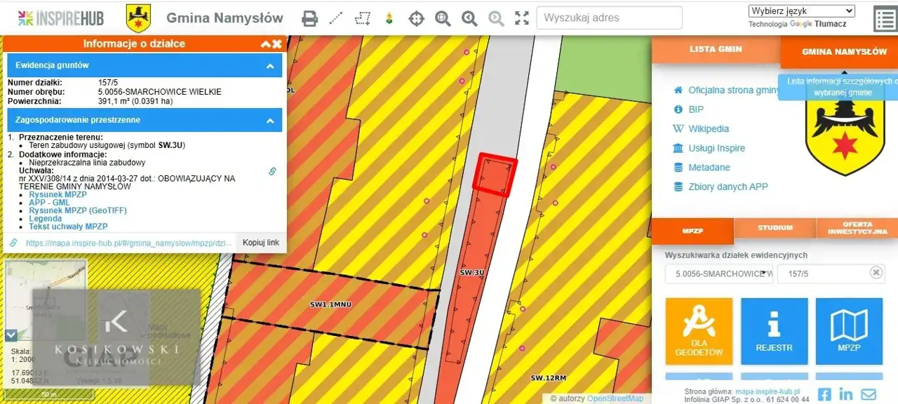 W Miejscowym Planie Zagospodarowania Przestrzennego obowiązującego na terenie Gminy Namysłów, przedmiotowa działka oznaczona jest symbolem SW.3U co oznacza, że przeznaczona jest pod teren zabudowy usługowej za którą uznaje się budynki min. takie jak: budynki kultury, nauki, oświaty i rozrywki, budynki zakwaterowania turystycznego i rekreacyjnego, budynki biurowe i konferencyjne, budynki handlu, gastronomii, budynki rzemiosła nieprodukcyjnego, budynki służby zdrowia, opieki społecznej i socjalnej, budynki administracji publicznej, stacje obsługi pojazdów, myjnie samochodowe, wraz z obiektami i urządzeniami budowlanymi związanymi z tą zabudową