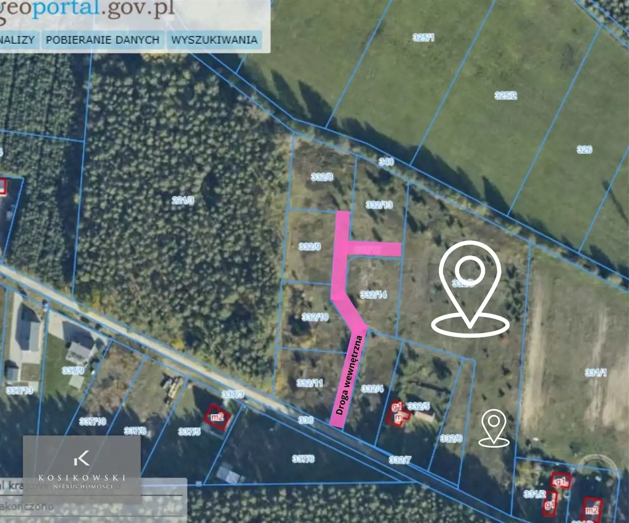 Dojazd do czterech działek odbywać się będzie poprzez drogę wewnętrzną stanowiącą działkę nr 332/12, w której należy nabyć udział wraz z kupnem działki. Cena udziału w drodze: 1 500 zł.