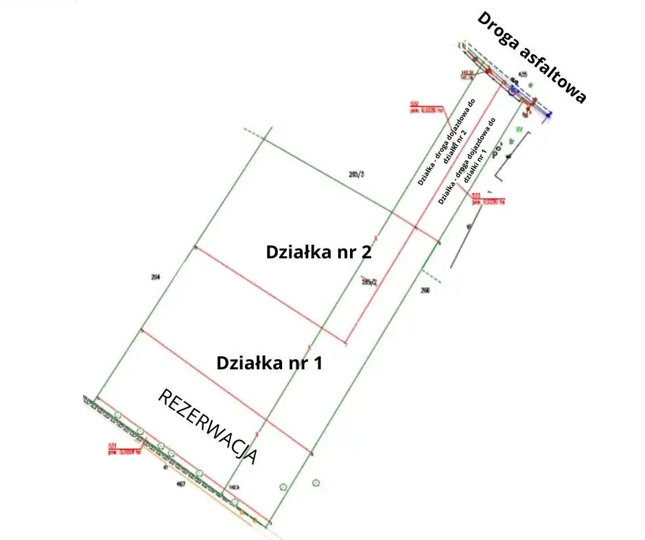 Oferujemy na sprzedaż dwie działki wraz z działkami stanowiącymi drogi dojazdowe.