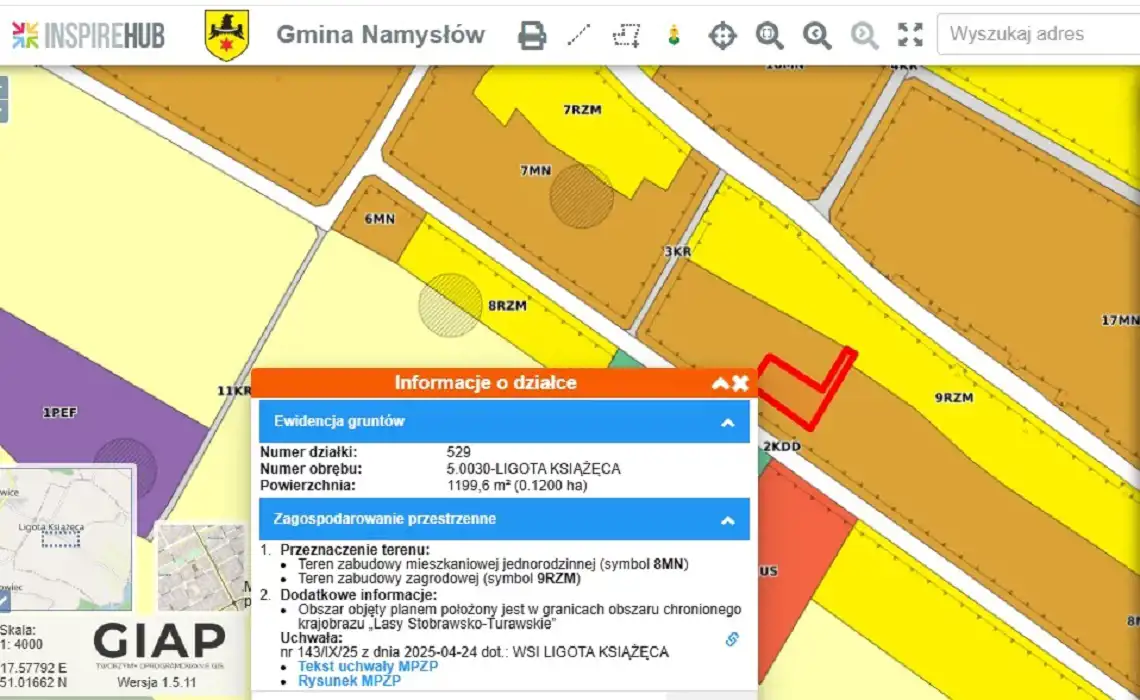 W Miejscowym Planie Zagospodarowania Przestrzennego wsi Ligota Książęca ( Uchwała Nr 143/IX/25 Rady Miejskiej w Namysłowie z dnia 24 kwietnia 2025 r. (Dz. Urz. Woj. Op. poz. 1141 z dnia 30 kwietnia 2025 r.) nieruchomość oznaczona jest symbolem o przeznaczeniu: