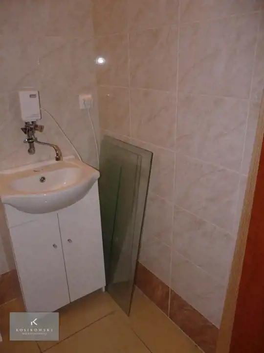 W tym pomieszczeniu na ścianach gładź, zaś na podłodze płytki ceramiczne. W budynku wykonano również pomieszczenie socjalne oraz łazienkę. W wykończeniu podobne - na ścianach kafelki, na podłodze płytki ceramiczne. W łazience znajduje się szafka z umywalką oraz toaleta. Całość sprawia, że lokal można wykorzystać według własnego uznania, gdyż nie wymaga żadnych dodatkowych kosztów związanych z dobudowywaniem pomieszczeń koniecznych do spełnienia wymogów sanitarnych.