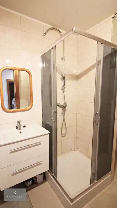 Łazienka o powierzchni ok. 3,5 m2, która w całości została pokryta płytkami ceramicznymi. Znajduje się w niej kabina prysznicowa, umywalka wraz z baterią. Oddzielne pomieszczenie stanowi toaleta o powierzchni ok. 1,5 m2, w całości została pokryta kaflami.