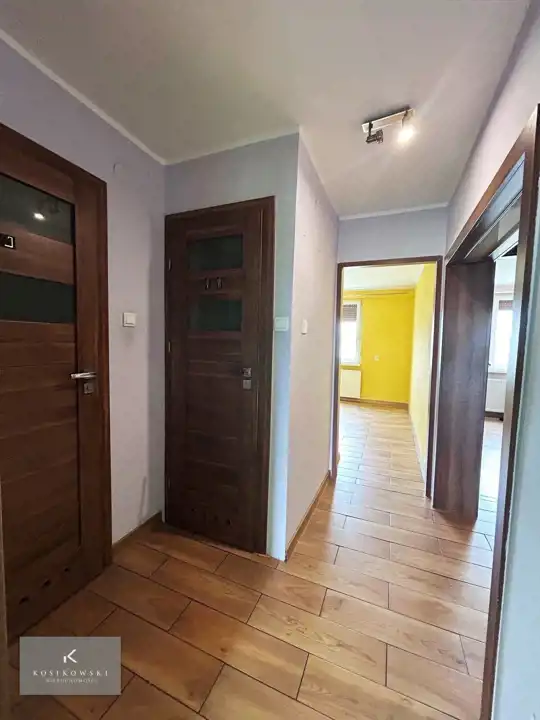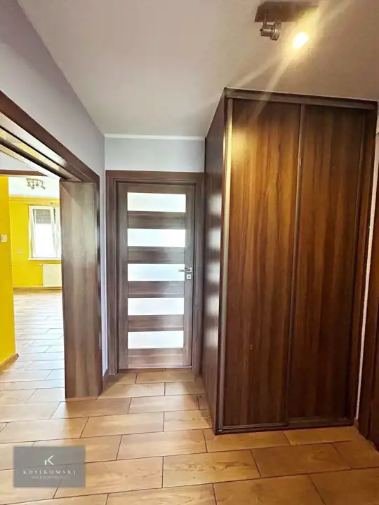 Z dużego przedpokoju dostaniemy się do każdego pomieszczenia w mieszkaniu. Podłogę pokrywają płytki. Przy wejściu znajduje się wbudowana szafa.