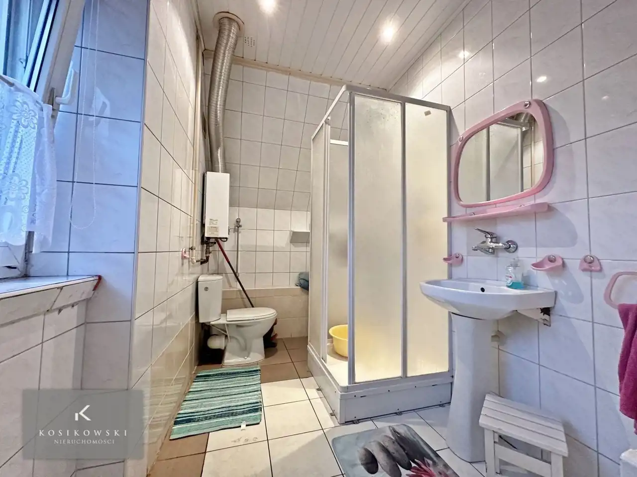 Kuchnia jest oddzielnym pomieszczeniem, przestronnym i zapewniającym komfort gotowania. Łazienka wyposażona jest w standardowe armatury, a także piec gazowy ogrzewający wodę. Korytarz stanowi praktyczną przestrzeń do codziennego użytku. Mieszkanie znajduje się na pierwszym piętrze, a dostęp do niego odbywa się przez własną, niezależną klatkę schodową, co zwiększa poczucie prywatności.