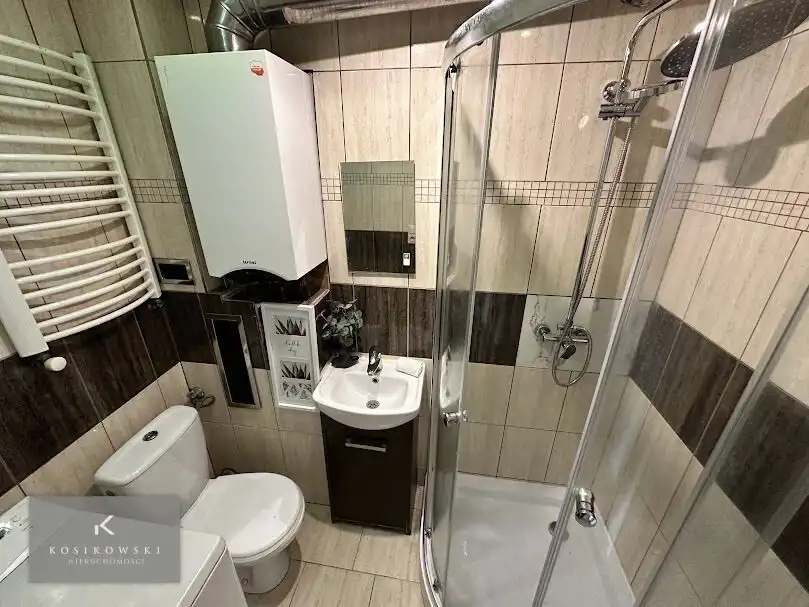 - Łazienka – mała, lecz funkcjonalna, z miejscem na wszystkie niezbędne elementy. Znajduje się w niej piec gazowy, będący źródłem ogrzewania i ciepłej wody.
