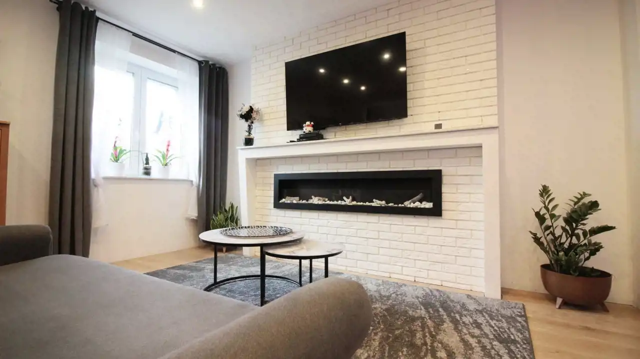 Wejście do nieruchomości rozpoczyna przestronny hol, w którym znajduje się duża szafa w zabudowie. Bezpośrednio z przedpokoju możemy przejść do salonu, który połączony jest z aneksem kuchennym. Duża i przestronna kuchnia została wyposażona w eleganckie meble z zabudowanym sprzętem AGD, dodatkowo jedna ze ścian została ozdobiona dekoracyjnymi płytkami. W salonie została wydzielona część wypoczynkowa oraz jadalniana, w której znajduje się stół z krzesłami. Dodatkowym atutem tego pomieszczenia jest bio-kominek, przy którym możemy spędzić miły i rodzinny wieczór. Na podłodze położono jasne panele a ściany zostały pomalowane w kolorze białym.