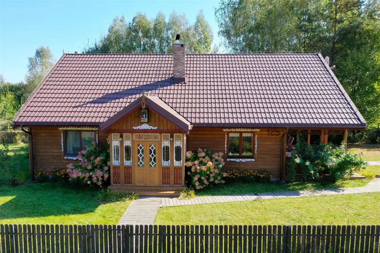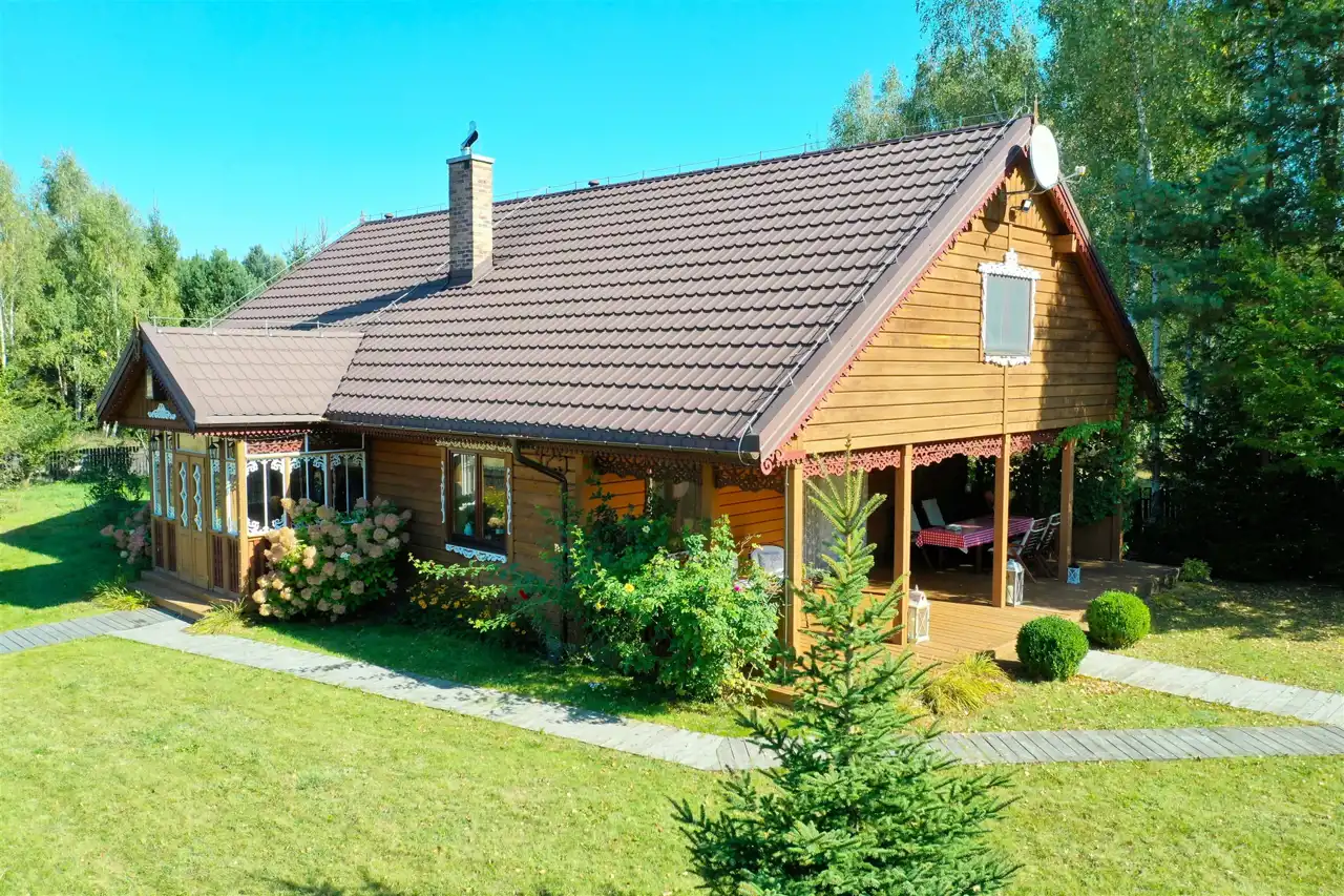Drewniany, rustykalny dom jednorodzinny o powierzchni użytkowej 180 m2 został wybudowany w technologii szkieletowej (dom kanadyjski) w 2012 roku. Jest zdobiony na wzór podlaski. Dach dwuspadowy, podwójnie ocieplony, pokryty jest blachodachówką. Wszystkie okna są drewniane, firmy Budwar. Budynek składa się z parteru oraz poddasza użytkowego. Wejście do budynku prowadzi poprzez zamykany ganek wykończony w stylu regionalnym.