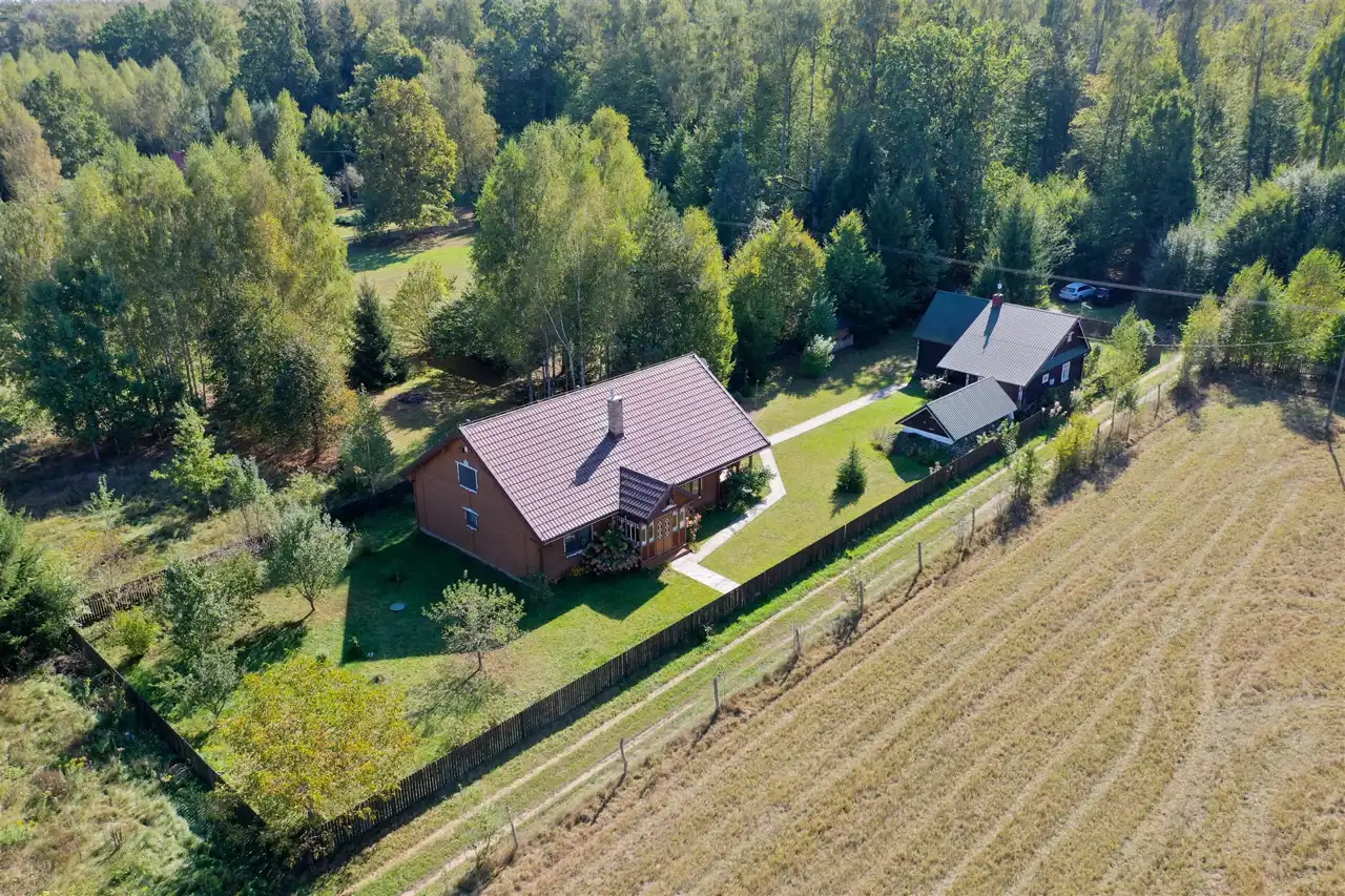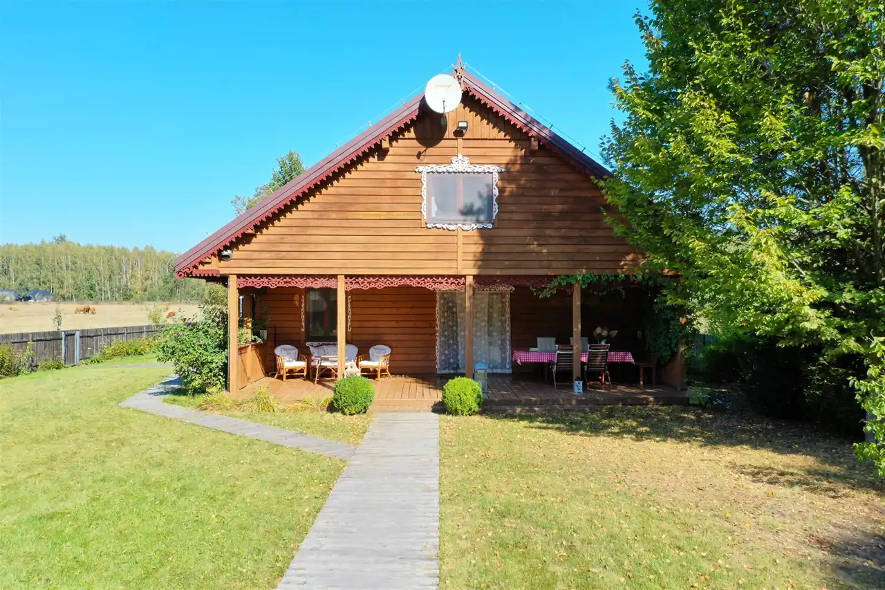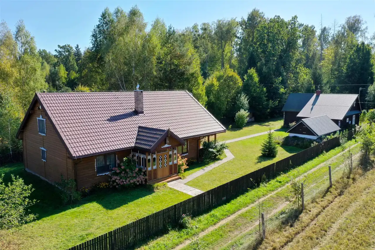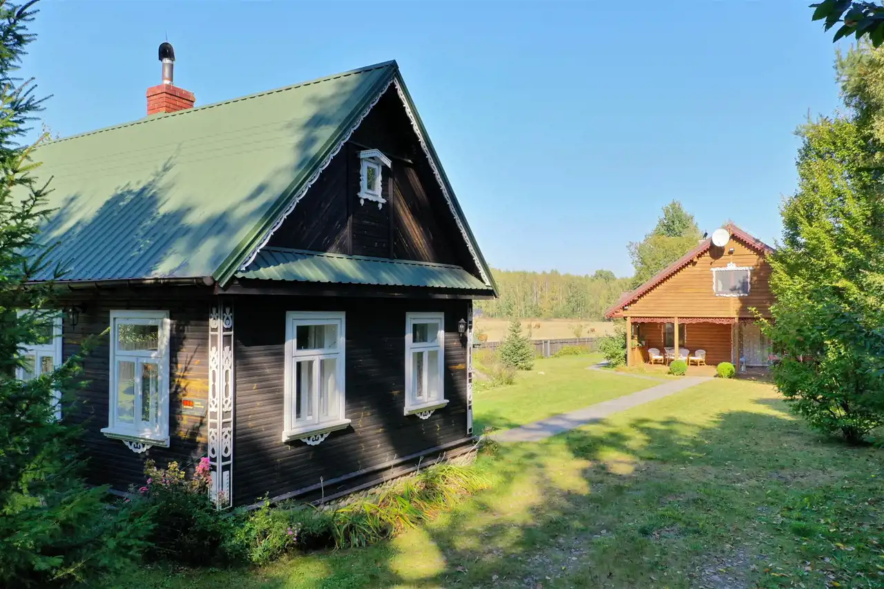 Drewniany dom gościnny o powierzchni użytkowej 55 m2 został wybudowany w 1947 roku z drewnianych bali, a następnie w roku 2014 przeszedł generalny remont. Dach dwuspadowy, ocieplony pokryty blachodachówką, wszystkie okna drewniane na wzór okien oryginalnych. Budynek składa się z salonu z aneksem kuchennym (28 m2), sypialni (20 m2), przedpokoju (3 m2) oraz łazienki (4 m2). Środek domu gustownie wykończony. Na podłogach terakota drewnopodobna, ściany oraz sufity wyłożone deską. W aneksie znajduje się oryginalna kuchnia kaflowa. W salonie i sypialni znajdują się bardzo ładne i stylowe piece kaflowe na drewno. Jasna łazienka wyłożona jest glazurą i terakotą. Wymienione zostały instalacje elektryczne oraz hydrauliczne. Przed domem znajduje się budynek gospodarczy - piwnica ziemna.