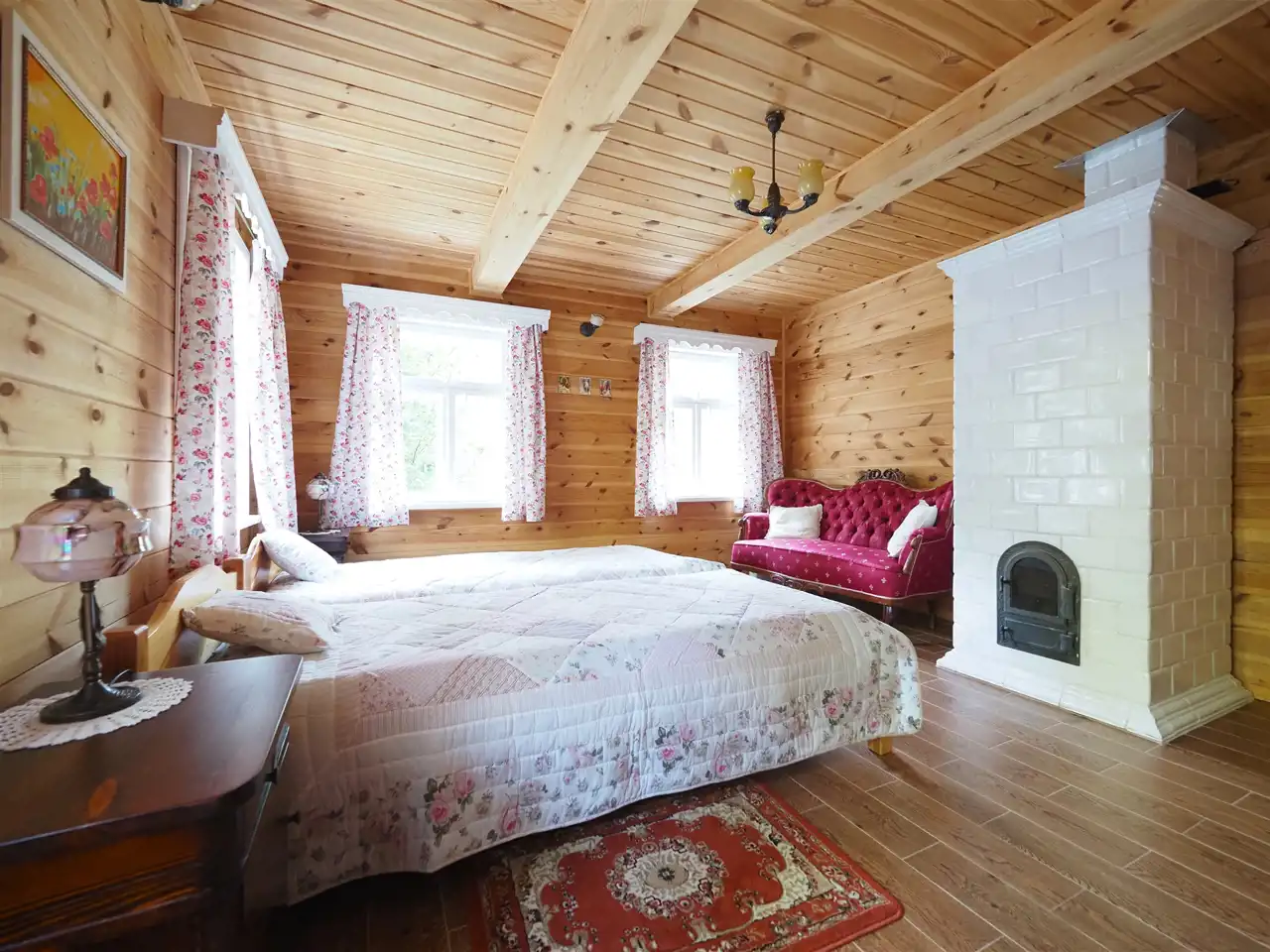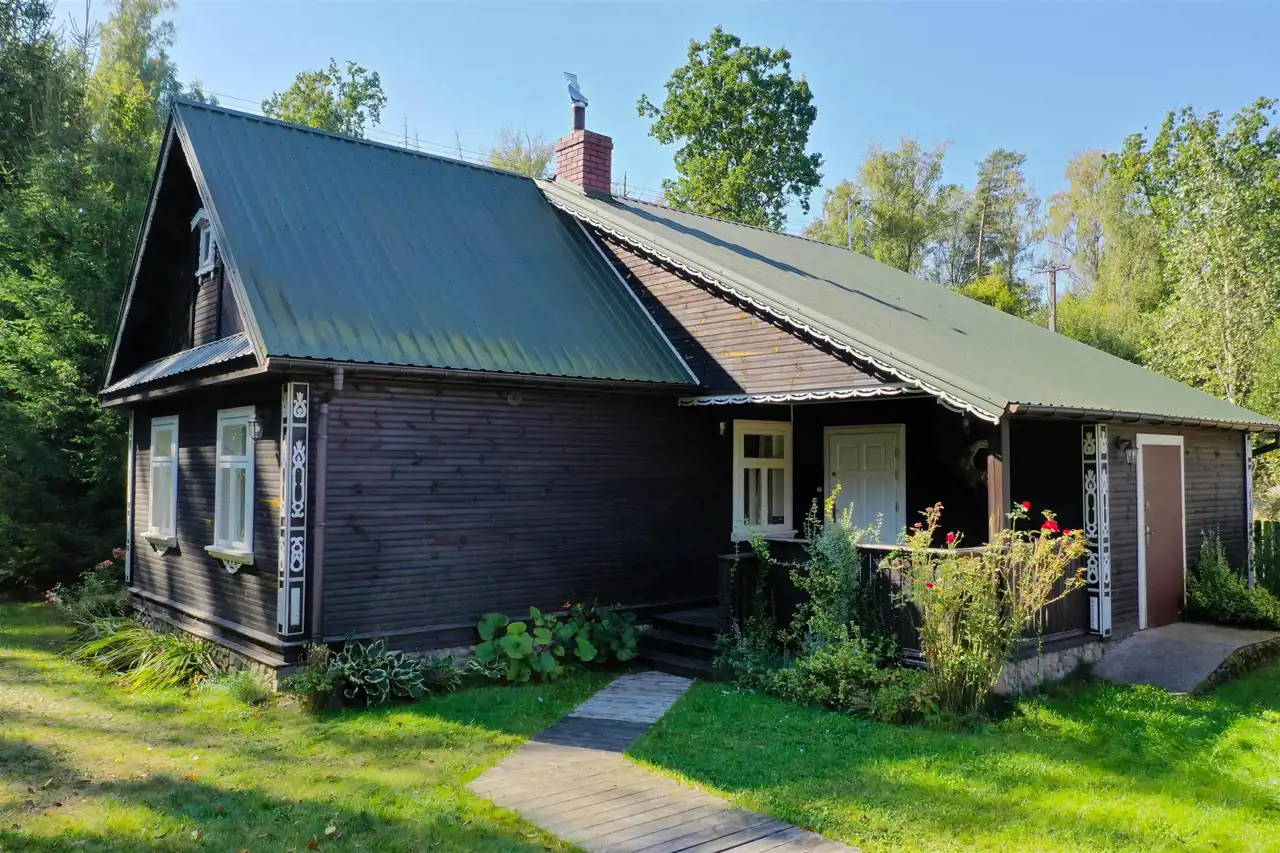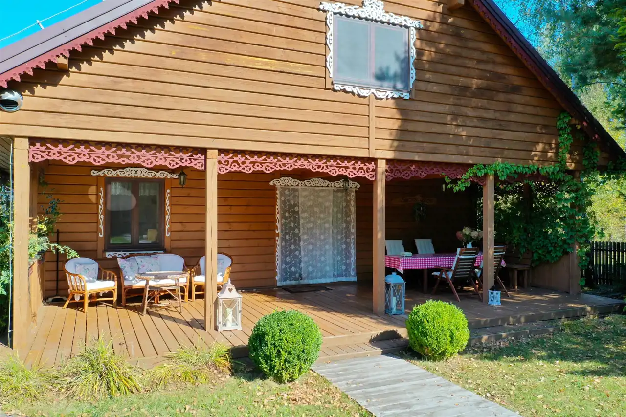 Drewniany dom gościnny o powierzchni użytkowej 55 m2 został wybudowany w 1947 roku z drewnianych bali, a następnie w roku 2014 przeszedł generalny remont. Dach dwuspadowy, ocieplony pokryty blachodachówką, wszystkie okna drewniane na wzór okien oryginalnych. Budynek składa się z salonu z aneksem kuchennym (28 m2), sypialni (20 m2), przedpokoju (3 m2) oraz łazienki (4 m2). Środek domu gustownie wykończony. Na podłogach terakota drewnopodobna, ściany oraz sufity wyłożone deską. W aneksie znajduje się oryginalna kuchnia kaflowa. W salonie i sypialni znajdują się bardzo ładne i stylowe piece kaflowe na drewno. Jasna łazienka wyłożona jest glazurą i terakotą. Wymienione zostały instalacje elektryczne oraz hydrauliczne. Przed domem znajduje się budynek gospodarczy - piwnica ziemna.