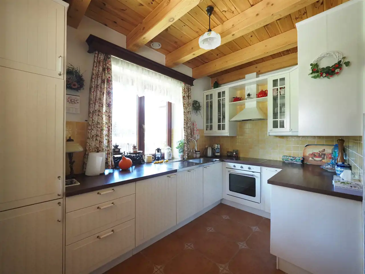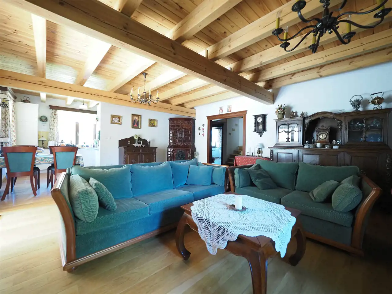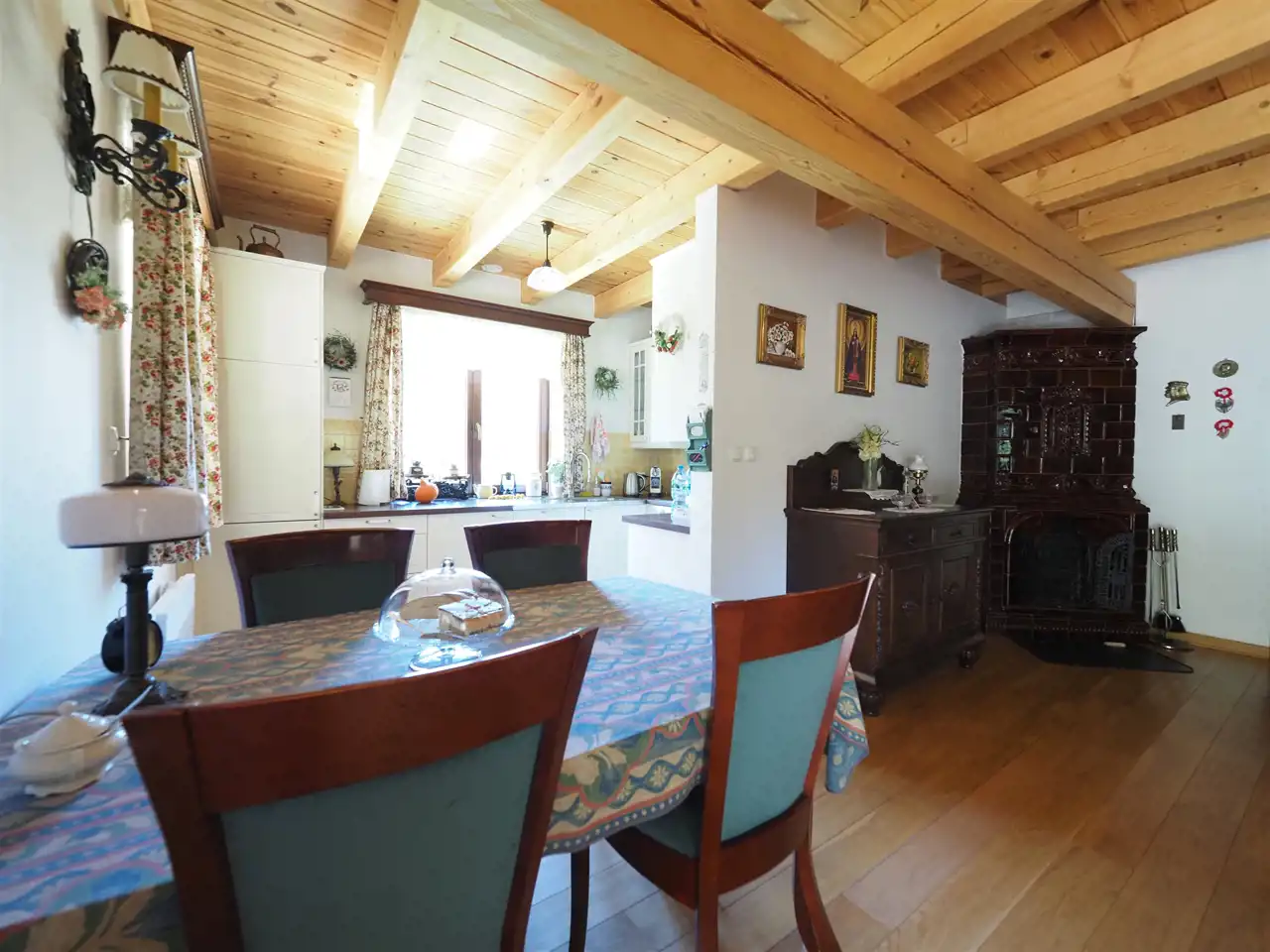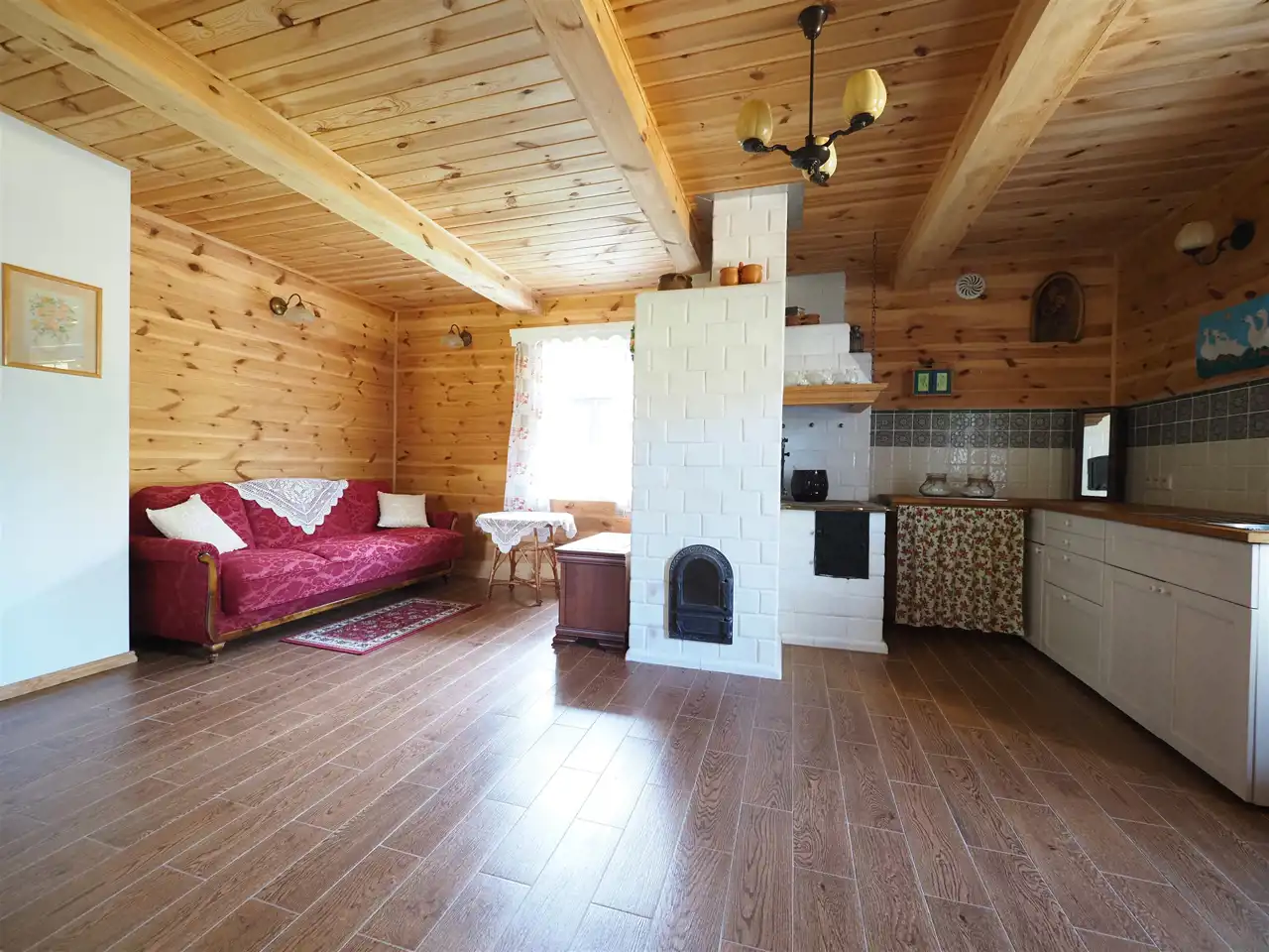Do domu przylega duży zadaszony taras o powierzchni 40 m2. Głównym źródłem ogrzewania jest wspomniany piec kaflowy, bardzo oszczędny w zużyciu drewna. W razie potrzeby można użyć ogrzewania wspomagającego w postaci grzejników elektrycznych zainstalowanych we wszystkich pomieszczeniach i sterowanych centralnym sterownikiem. Nowe instalacje elektryczne i hydrauliczne.