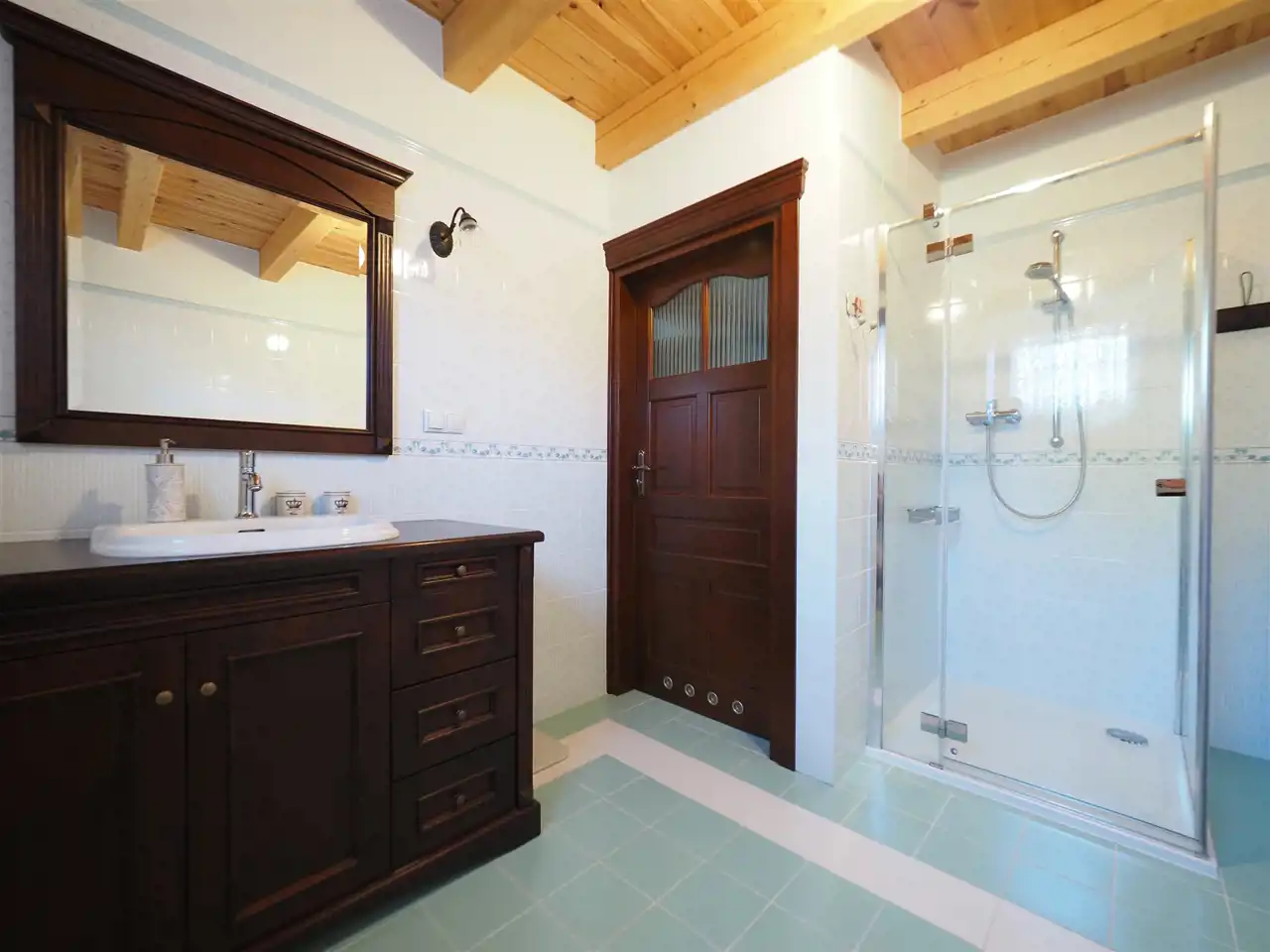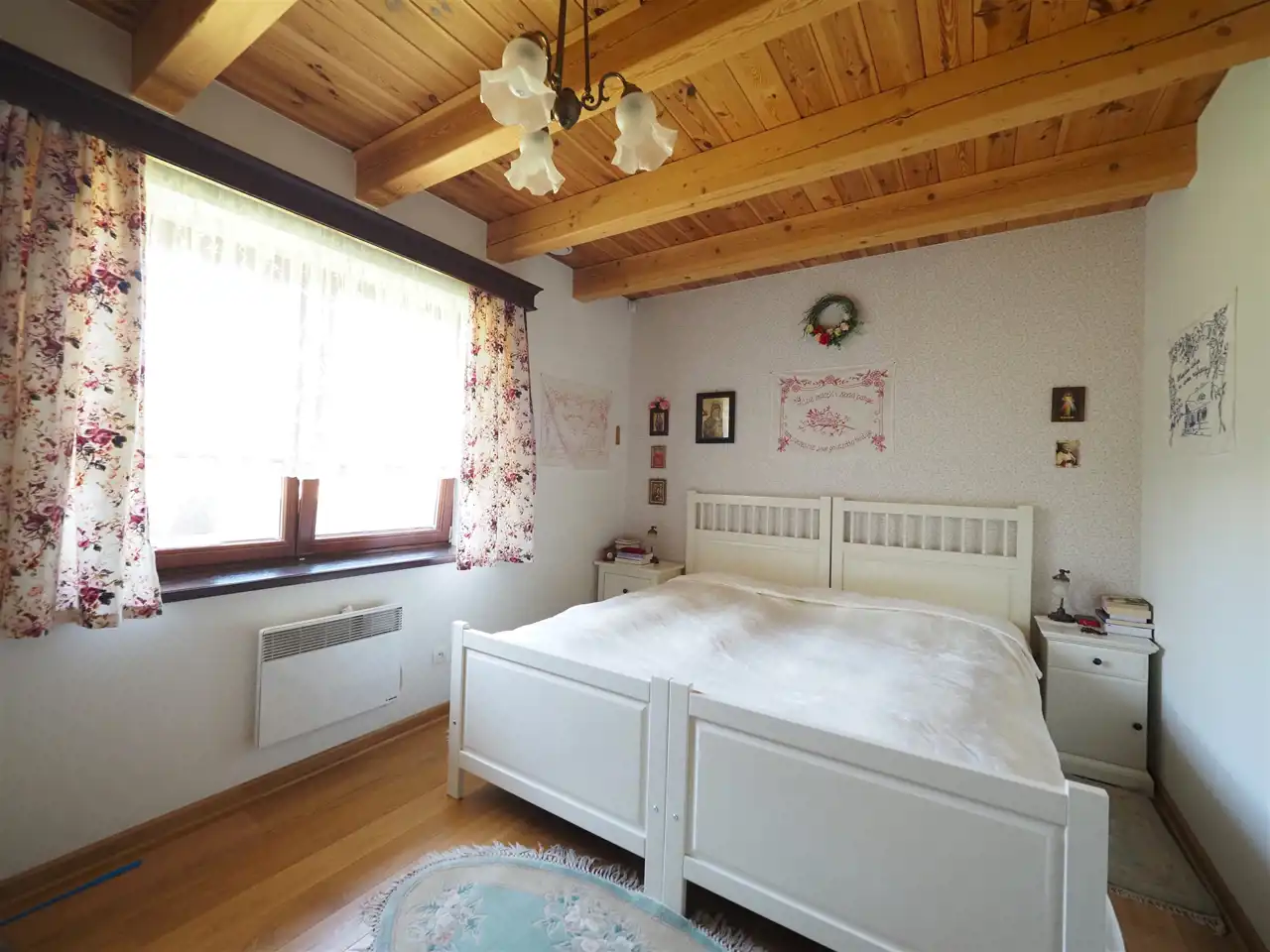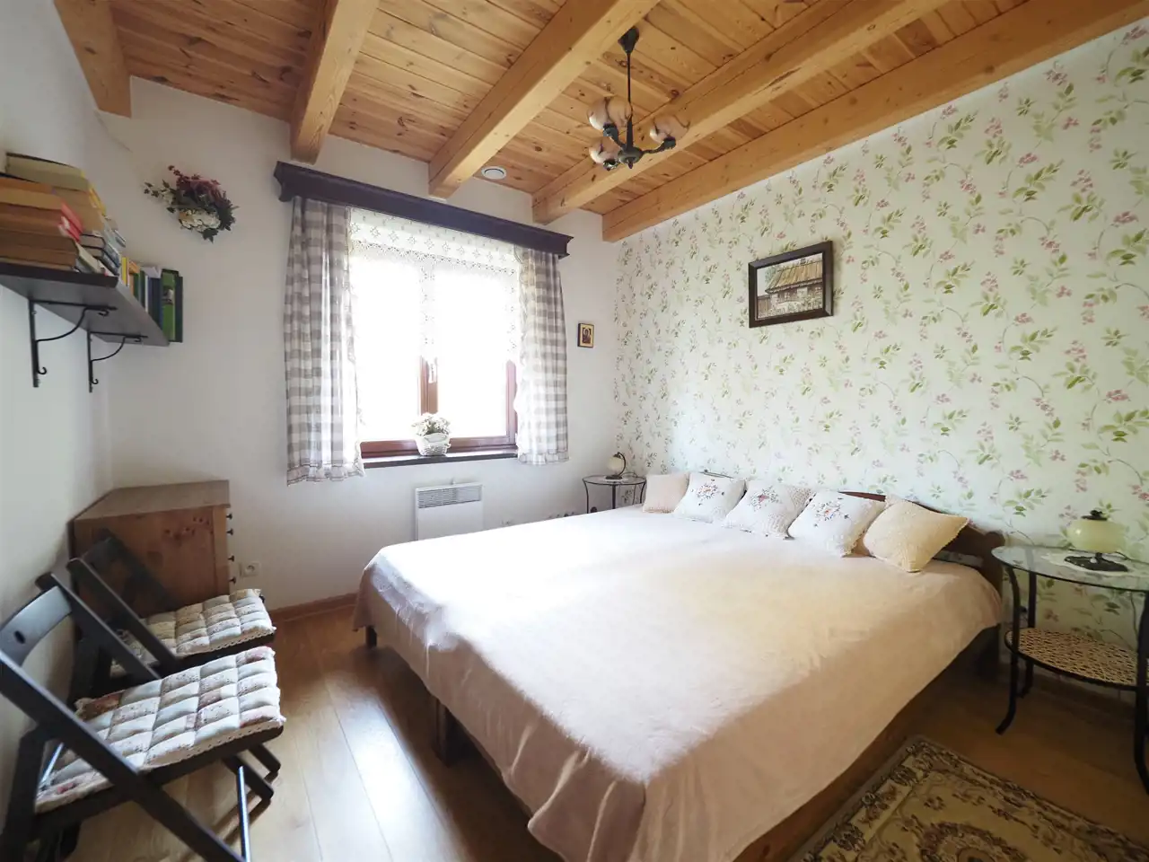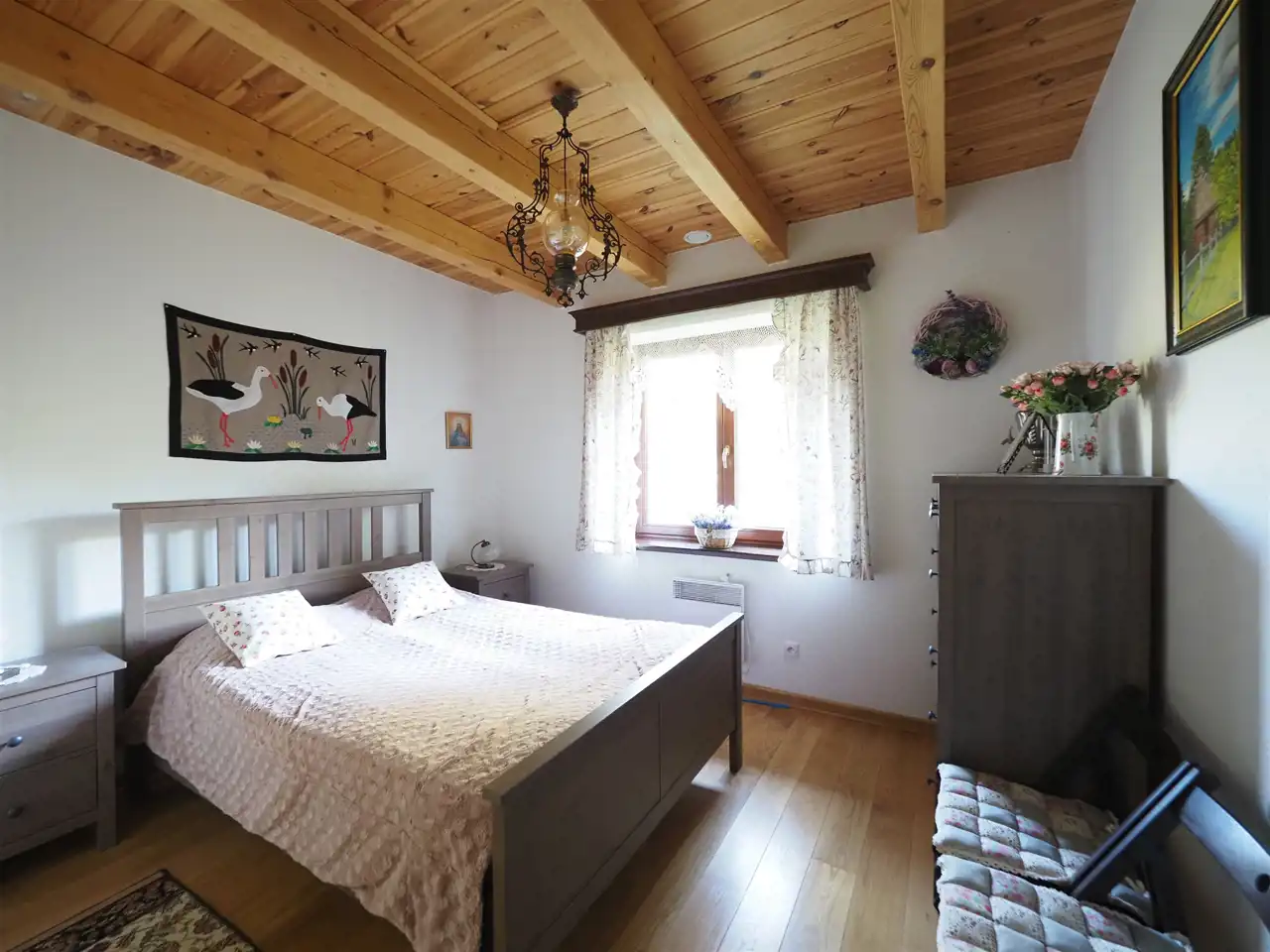 Dębowe schody prowadzą na poddasze o powierzchni użytkowej 66 m2, na którym wygospodarowano dwie sypialnie oraz garderobę. Ściany wykończone zostały boazerią a podłogi deską sosnową. Wszystkie sufity w budynku wyłożone zostały deską. Drzwi wejściowe antywłamaniowe.