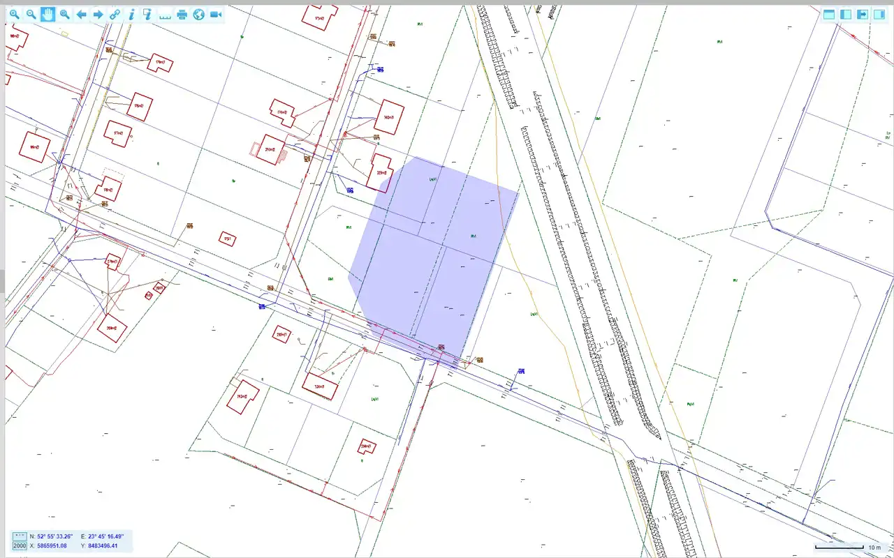 Działka narożna w kształcie trapezu o wymiarach ~ 40 x 28 m