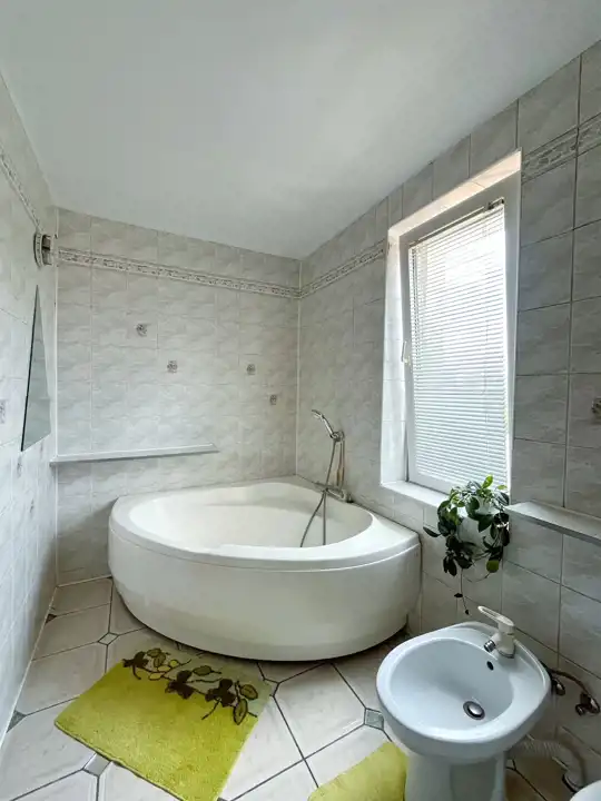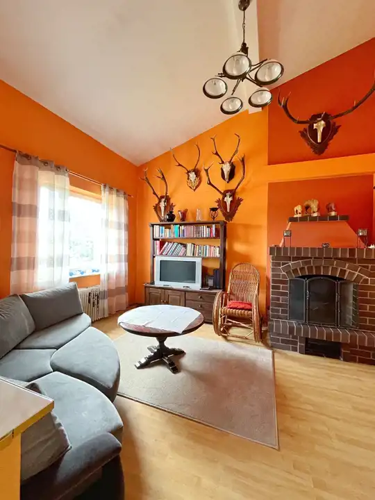 - Pierwsze piętro: dwie sypialnie, otwarty pokój z kominkiem, łazienka wyposażona w wannę.
