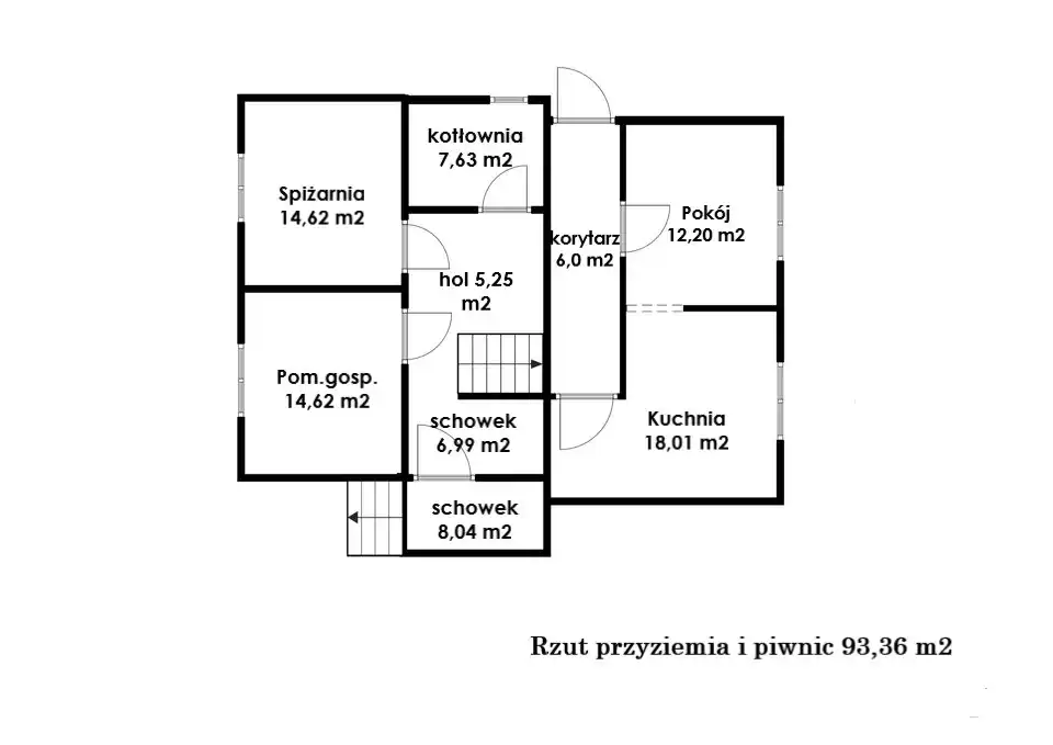 Łączna powierzchnia przyziemia i piwnic wynosi 93,36 m2 (pow. użytkowa 77,69 m2)