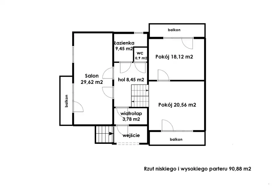 Wysoki parter stanowią dwa przestronne pokoje z balkonami.
