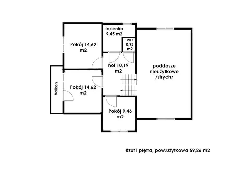 Powierzchnia pomieszczeń pierwszego piętra wynosi 59,26 m2.