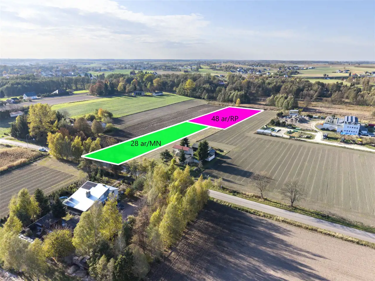 Działka w kształcie prostokąta o wymiarach: szer. 27 m i dł.109 m. Teren jest płaski, nieogrodzony. Nieruchomość stanowi teren przeznaczony pod zabudowę mieszkaniową, z dopuszczeniem usług. Druga część działki jest częścią rolną o wymiarach: szer. 41,5 m x 114 m. W tej części jest przeznaczona pod uprawy polowe (RP). Istnieje możliwość nabycia całości wraz z częścią rolną RP, o łącznej powierzchni 7600 m2, w cenie 259 tys.