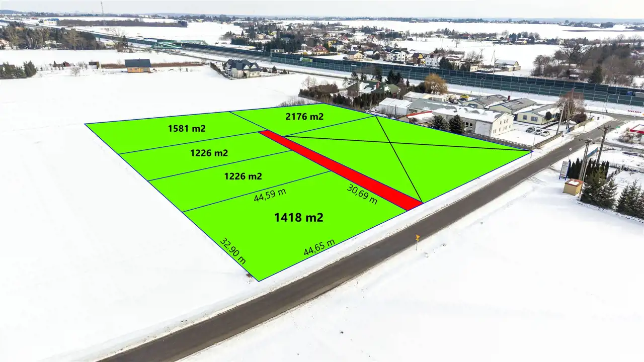 Działka jest płaska, położona w I linii zabudowy. Ma kształt jest prostokąta, a jej wymiary działki wynoszą 30,9 m x 44,65 m.