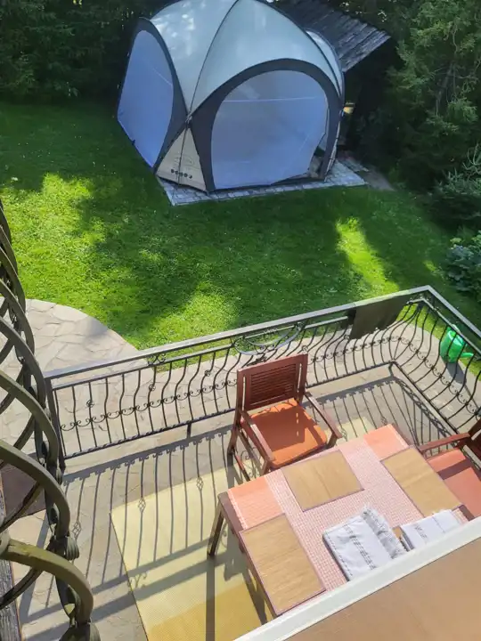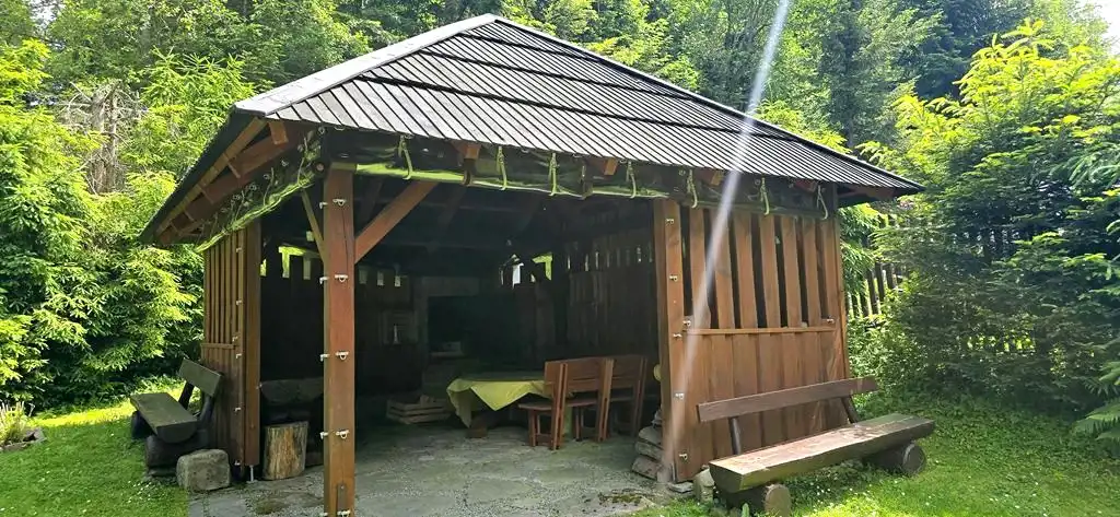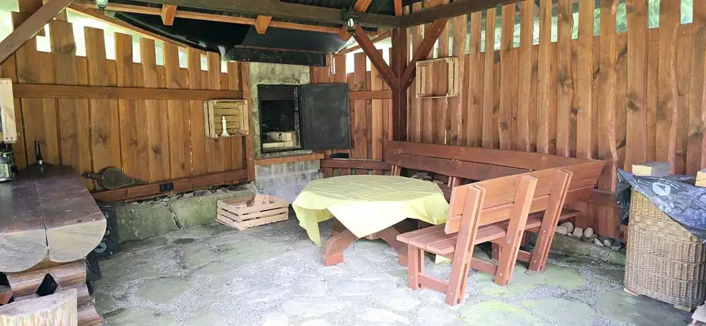 - duża altana ogrodowa z grillem i meblami ogrodowymi (altana wyposażona w składane zasłony chroniące przed warunkami atmosferycznymi)