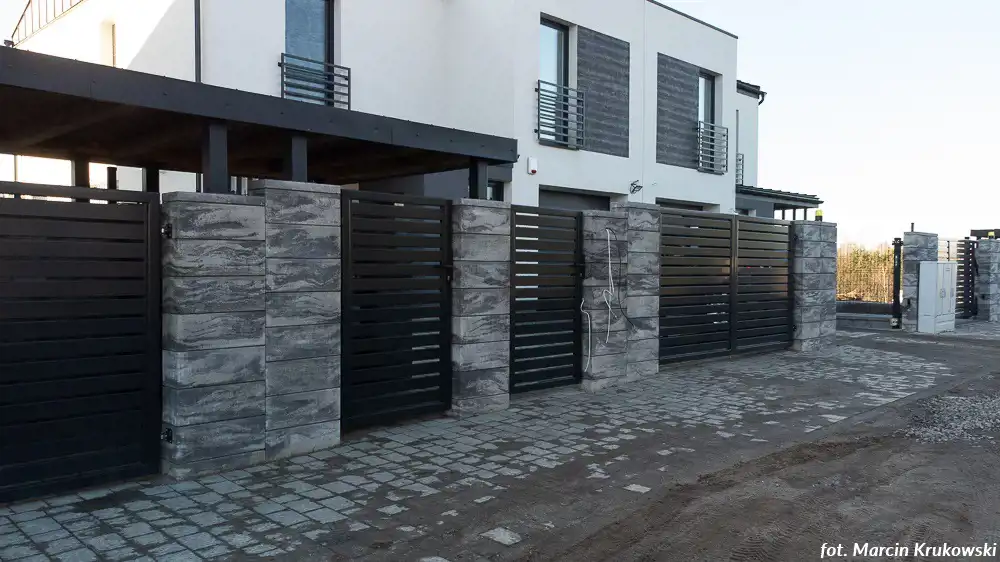 Ogrodzenie frontowe wykonane w technologii murowej, tył i boki w formie ogrodzenia panelowego ze stali ocynkowanej. Brama wjazdowa przesuwna otwierana elektrycznie. Furtka z elektrozaczepem. Wiata śmietnikowa. Opaska, podjazd do garażu, przejście od furtki do budynku z kostki brukowej.