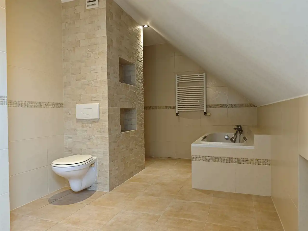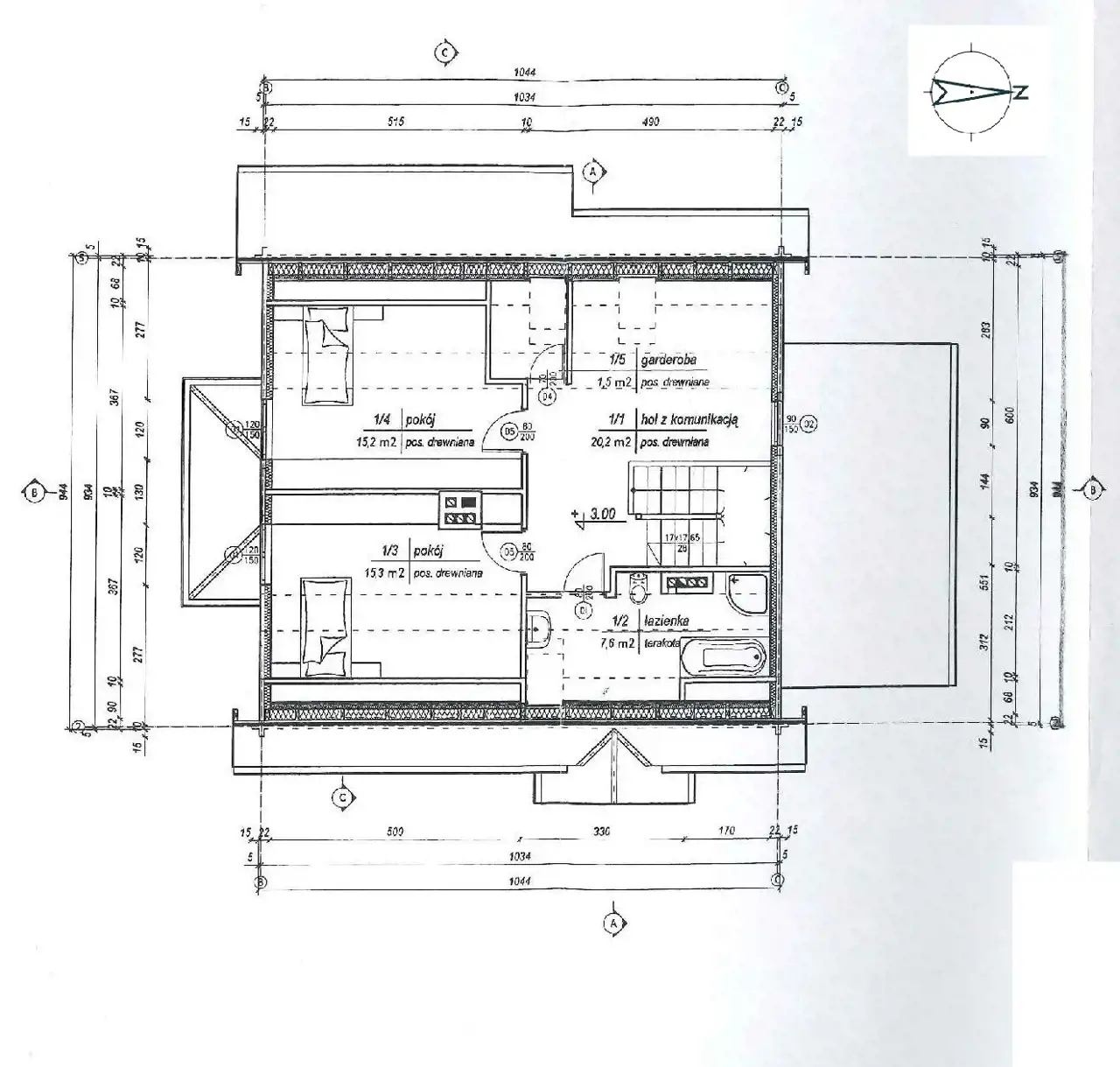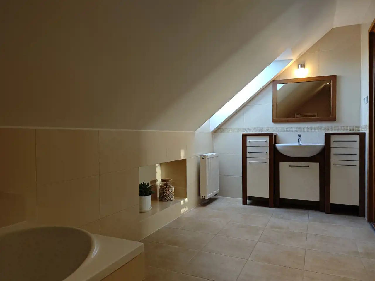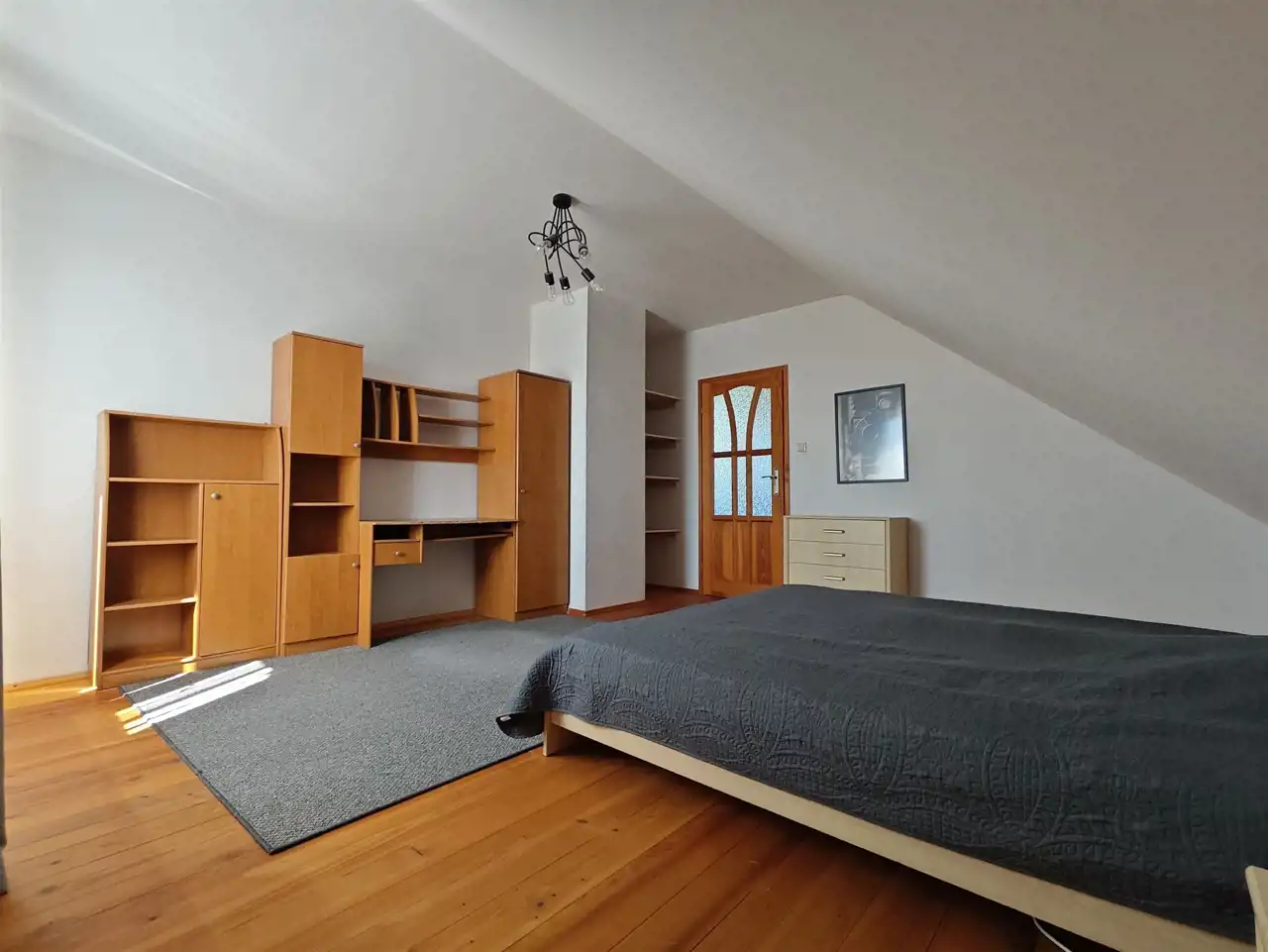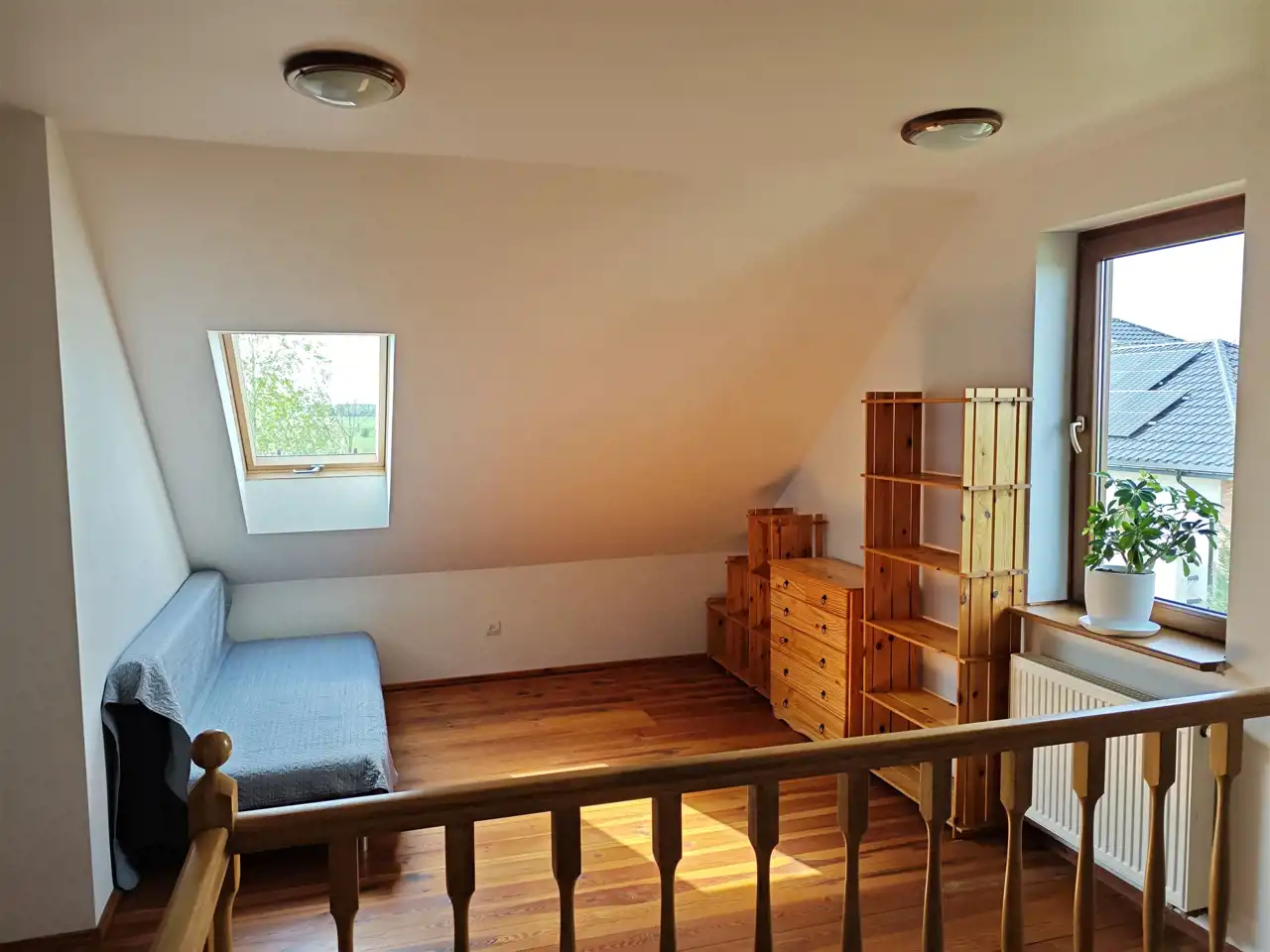 Na poddaszu użytkowym garderoba, łazienka, dwie przestronne sypialnie (ok. 20 m2 netto po podłogach) oraz możliwość zrobienia trzeciej (w tej chwili jest to otwarta przestrzeń, a la antresola).
