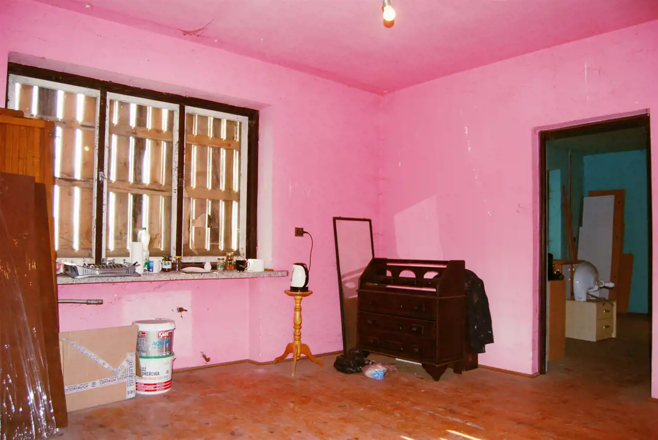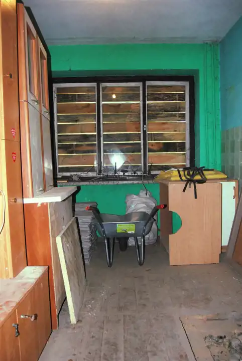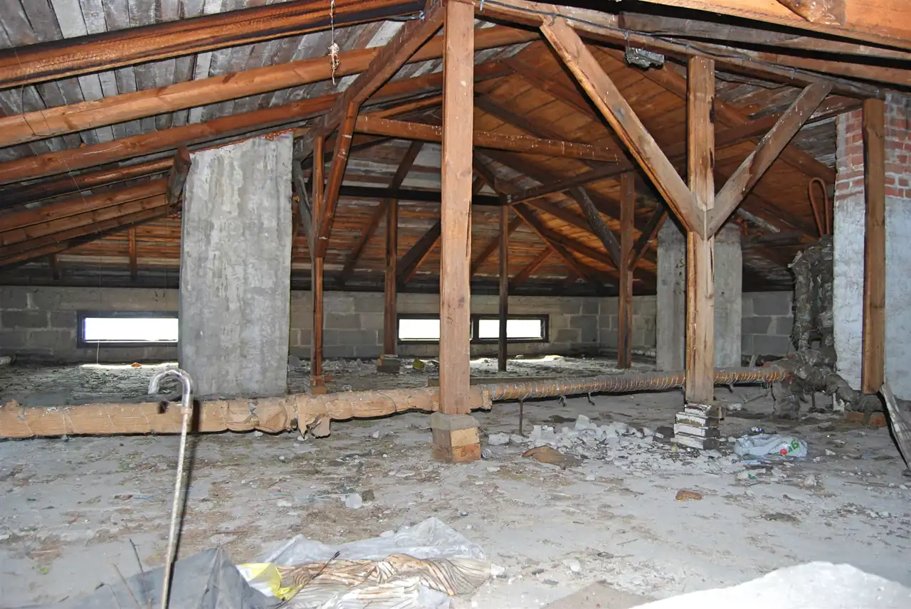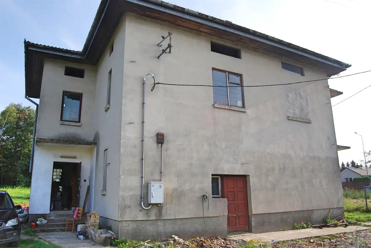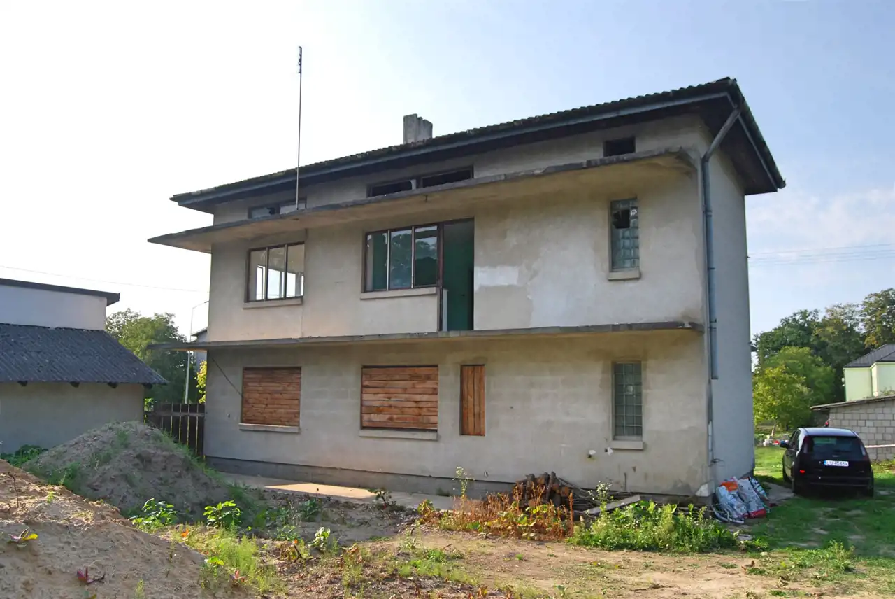 Stan nieruchomości do remontu - okna stare drewniane, brak grzejników i kotła CO, dach kryty eternitem.