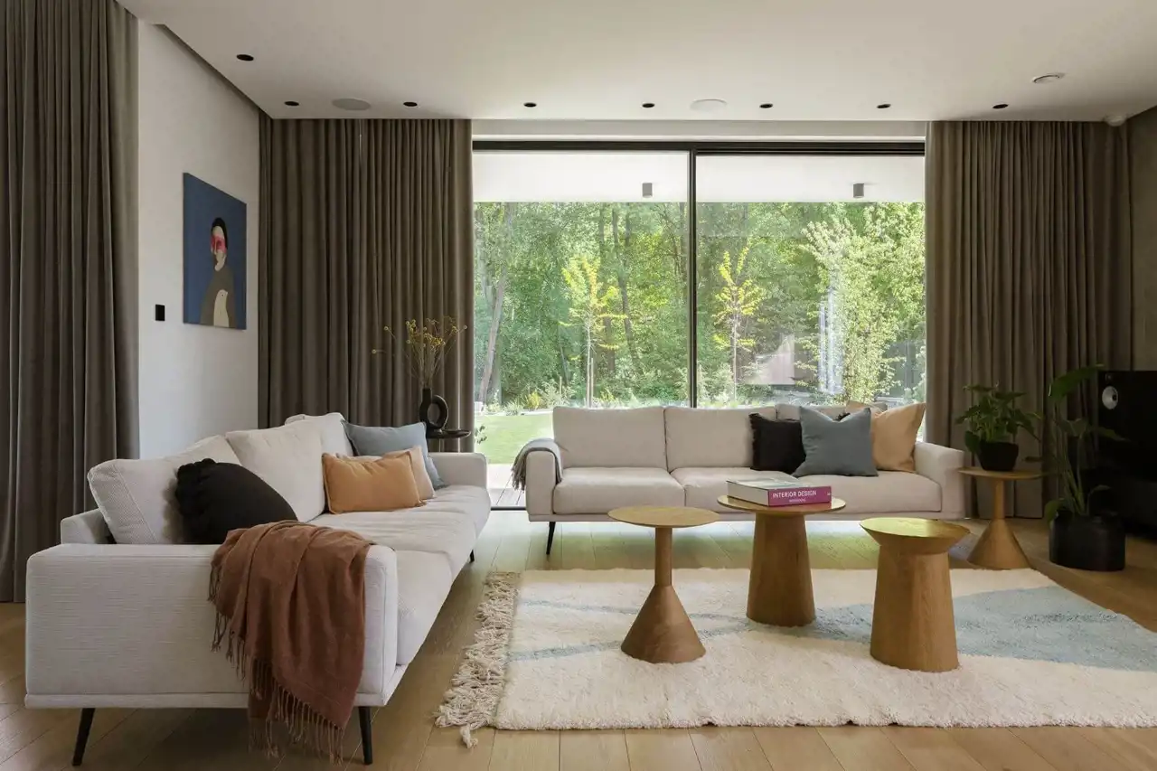 Wnętrze zaprojektowane z myślą o rodzinieCentralnym punktem domu jest jasny salon z dużymi przeszkleniami i wyjściem na taras – przestrzeń naturalnie łączy się z ogrodem i daje poczucie otwartości.