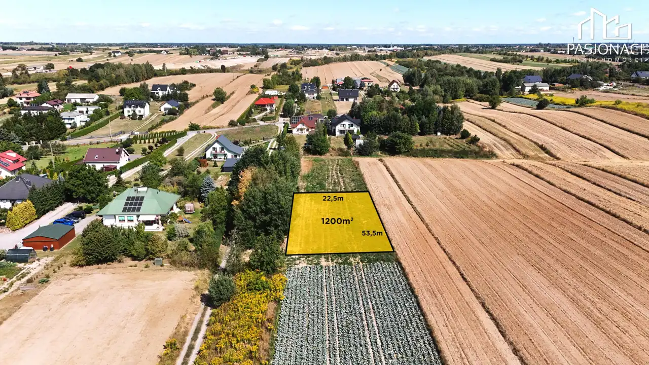 Powierzchnia 1200 m², wymiary 22,5 x 53,5 m, kształt prostokąta, co ułatwia planowanie i budowę wymarzonego domu.