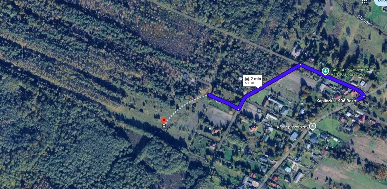 Dojazd leśną drogą gruntową, 370m od utwardzonej ulicy gminnej. Stan prawny tej "zwyczajowej" drogi nie jest uregulowany.