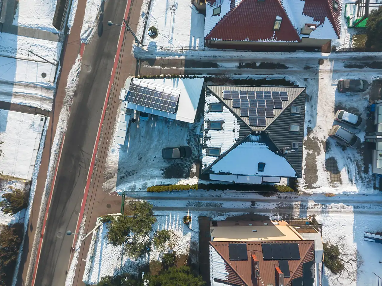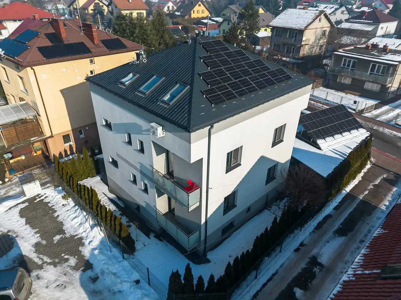 Osobna instalacja fotowoltaiczna znajduje się również na wiacie garażowej i rowerowej, co dodatkowo obniża koszty eksploatacyjne.