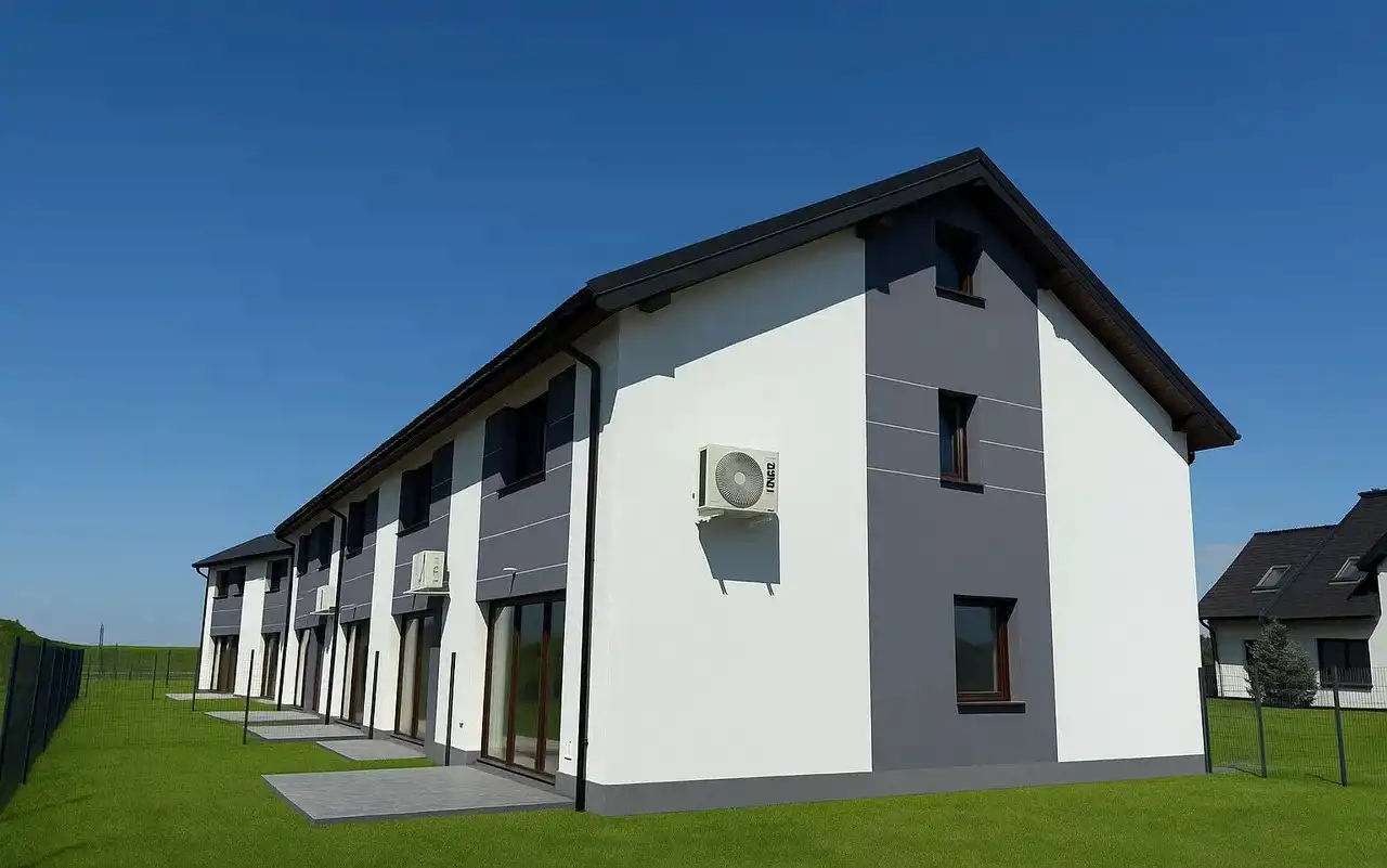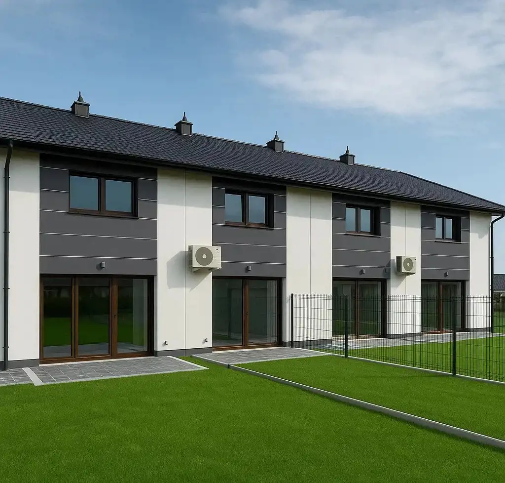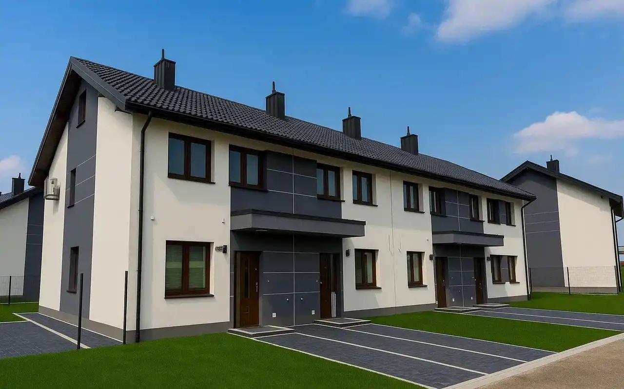 Domy w zabudowie szeregowej w stanie deweloperskim z dwoma przynależnymi miejscami postojowymi na podjeździe.