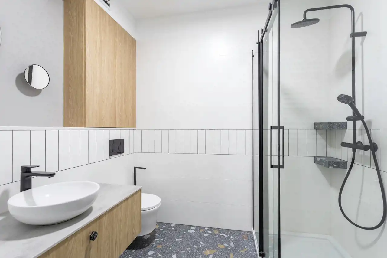 W łazienkach doceniono Polską fabrykę Stargres. Zakupione poprzez Krakowski salon Max-Fliz wzór Terazzo, który w połączeniu z ponadczasową bielą tworzy praktyczne i eleganckie wnętrze.