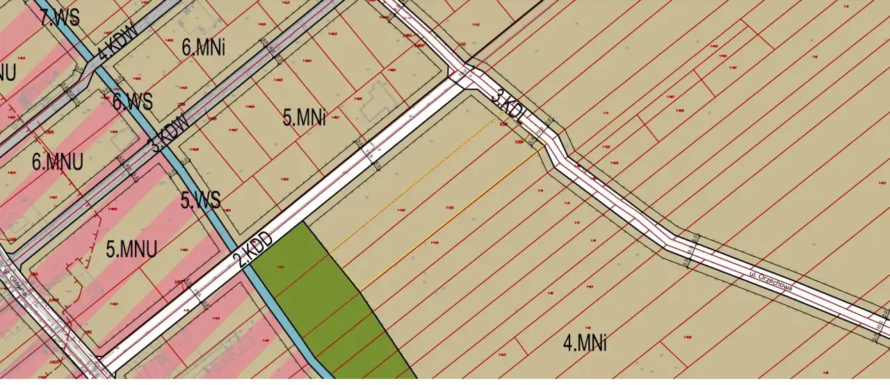 The plot is covered by the local spatial development plan: MNi - area of intensive single-family residential development (detached or semi-detached). Development guidelines and land development indicators: