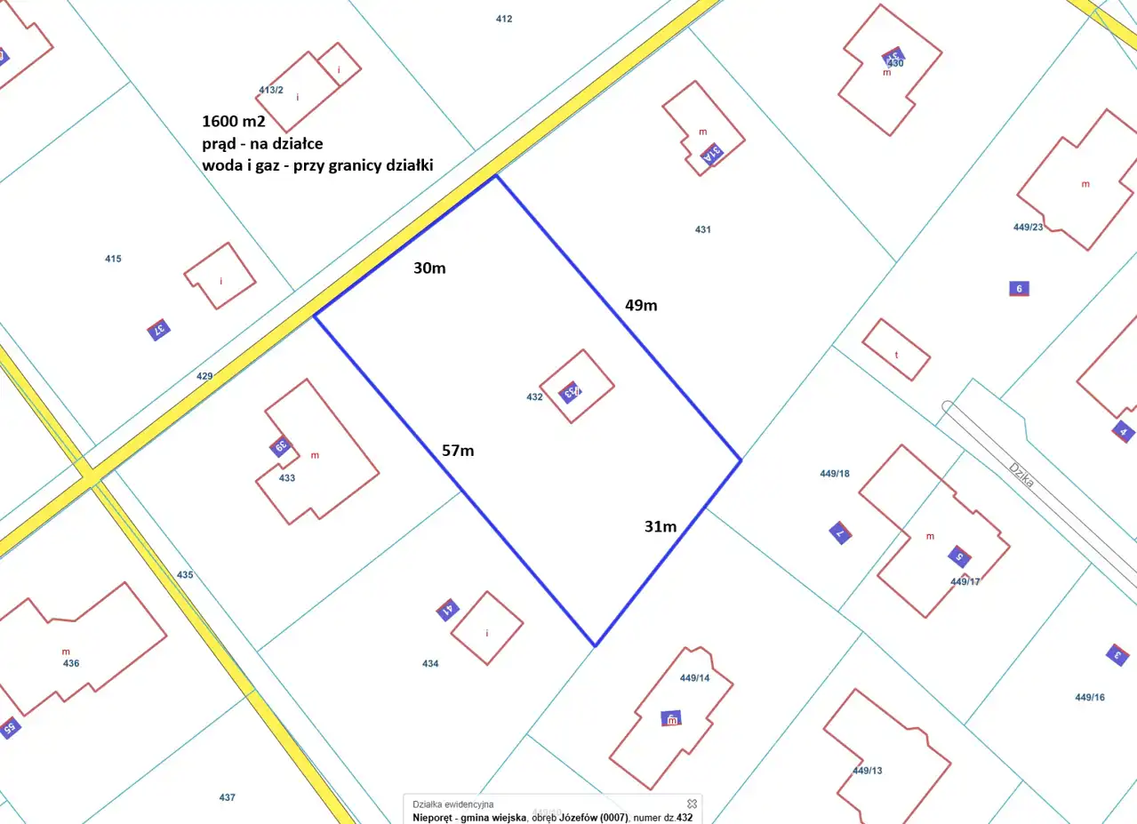 - Media Woda: w ulicy; Kanalizacja: brak; Prąd: na działce; Gaz: w ulicy