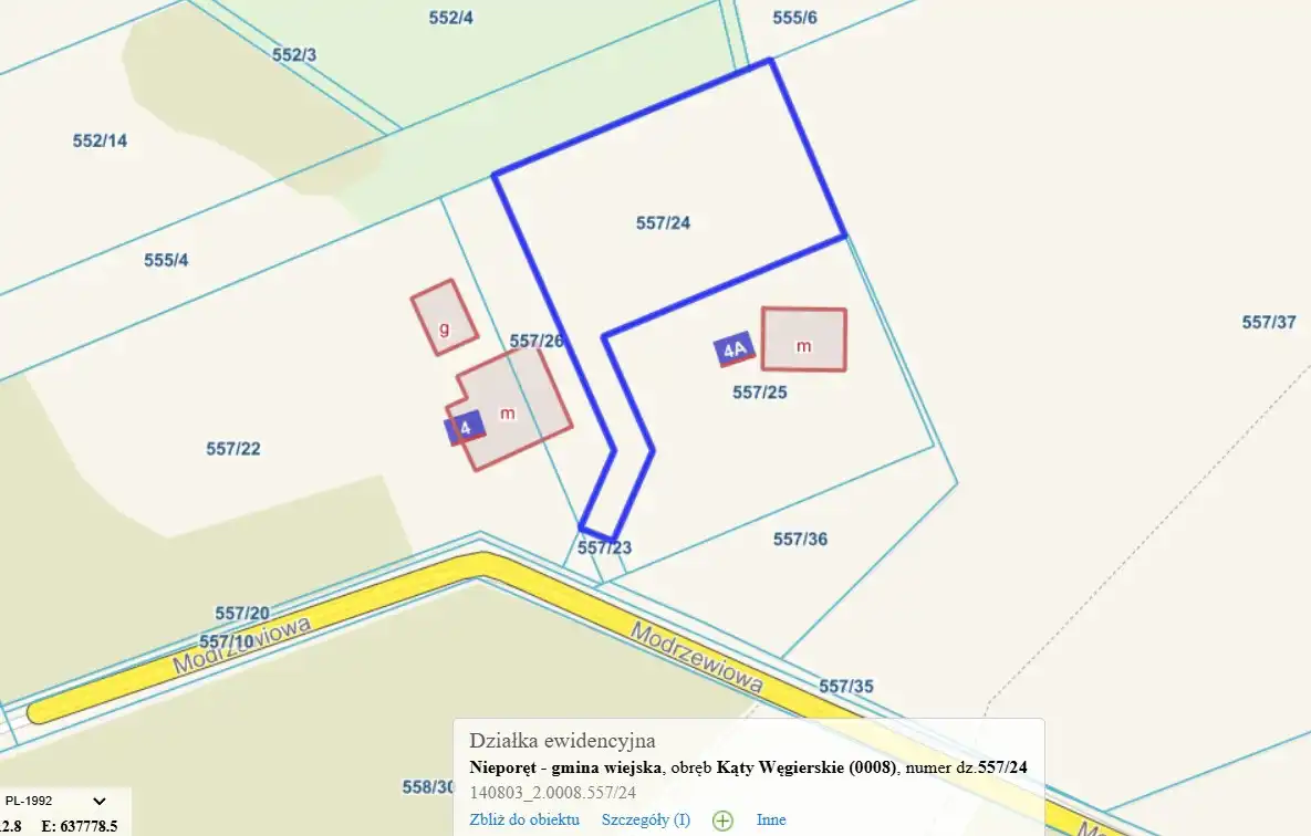 Działka budowlana położona w Kątach Węgierskich w gminie Nieporęt o powierzchni 1291 mkw (nr ew. 557/24). Działka posiada dostęp do drogi publicznej, utwardzonej – ulicy Modrzewiowej. Objęta MPZP z przeznaczeniem usługowo – mieszkaniowym. Na 1/3 czesci działki przebiegają linie średniego napięcia, teren do zabudowy wynosi około 800 mkw. Działka jest ogrodzona siatką z podmurówką, bez bramy.