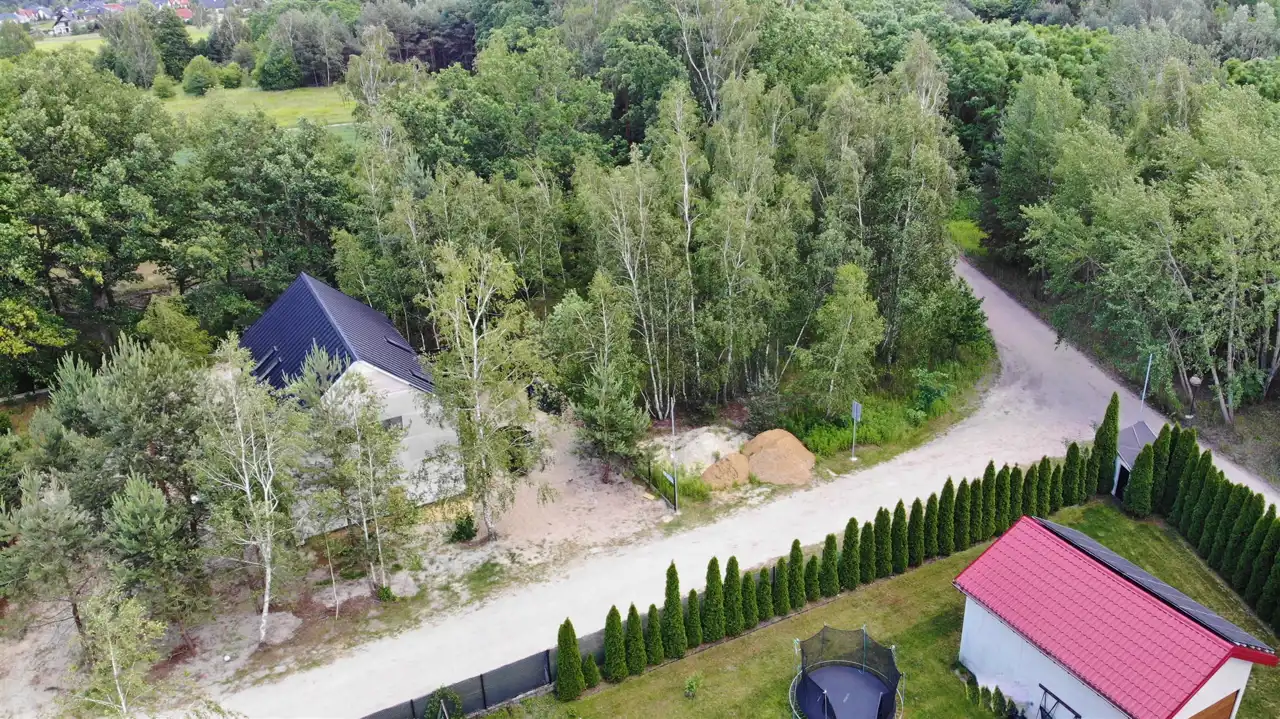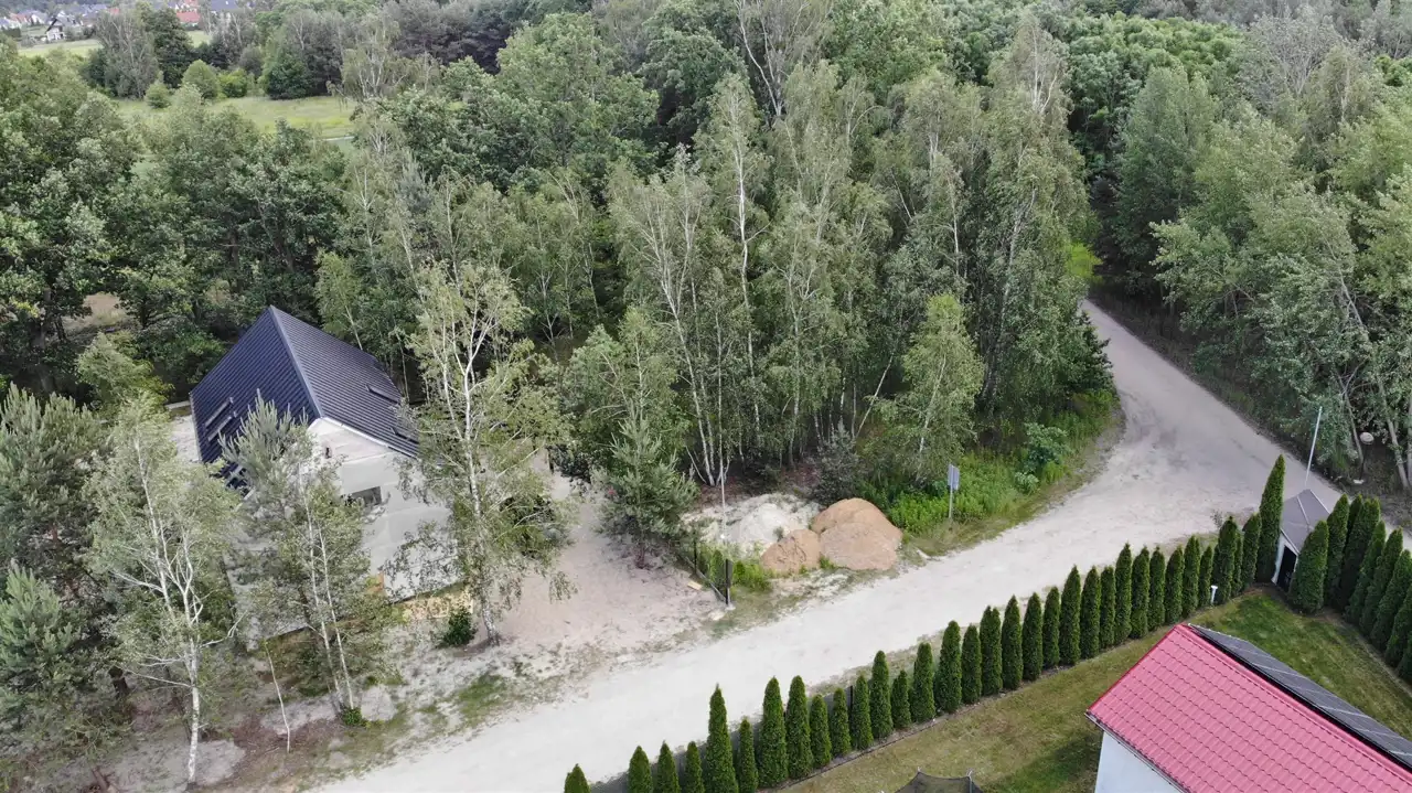 Narożna działka z dostępem do drogi gminnej oraz prywatnej, co zapewnia komfortowy dojazd i elastyczność w planowaniu wjazdu.