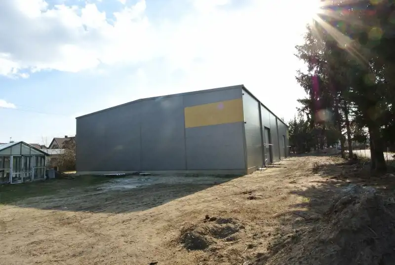 Hala nieogrzewana. Wymiary: 23x40m. Wysokość: 7m (9 m w kalenicy). Konstrukcja: stalowa, bez słupów nośnych. Dwie bramy o wymiarach 4x4,5. Wentylacja grawitacyjna.