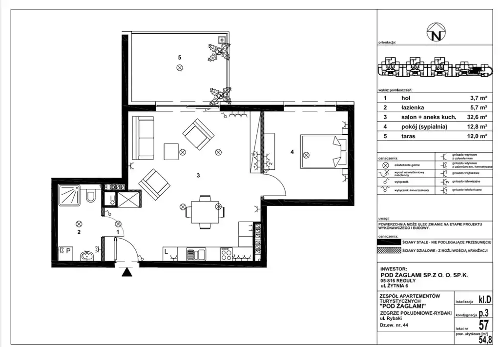 Powierzchnia apartamentu 54,8m2 - składa się z salonu z aneksem kuchennym 32,6m2 , sypialni 12,8m2, łazienki 5,7m2 oraz holu 3,7m2 . Ponadto apartament posiada taras 12m2 , z którego roztacza się bezpośredni widok na Zalew Zegrzyński .
