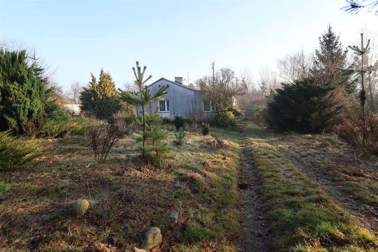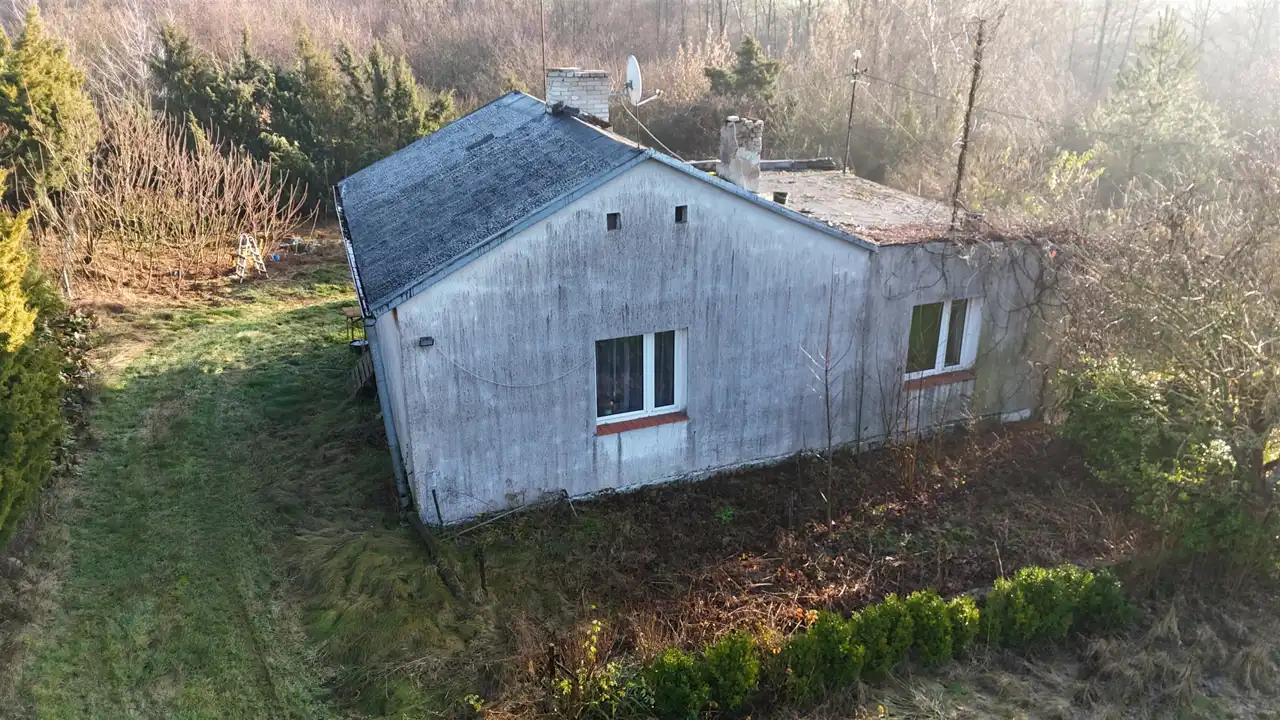 Budynek mieszkalny o powierzchni 80 m2, pobudowany w latach 70-tych z pustaka żużlowego, docieplony 8-centymetrowym styropianem. Strop betonowy. W większości domu posadzki betonowe. Okna PCV starego typu. W większej części domu posadzka betonowa. Dach konstrukcji drewnianej, kryty papą. Nad częścią mieszkalną, poddasze nieużytkowe.