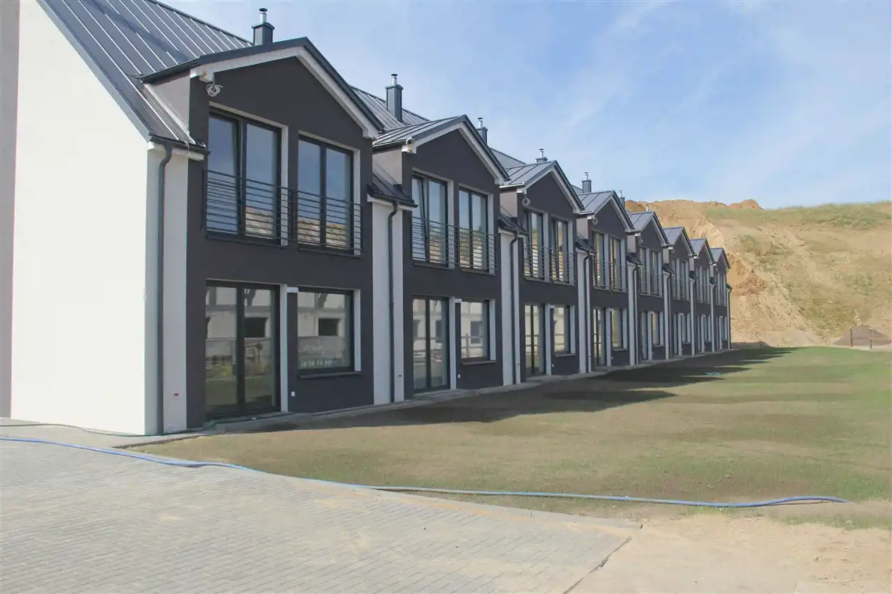 Oferujemy do sprzedaży atrakcyjnyjne domy w zabudowie szeregowej z ogrodami usytuowane przy ulicy Dworcowej na nowo powstającym osiedlu domów jednorodzinnych zaledwie 2,5 km od centrum Lęborka . Nieruchomość składa z parteru w skład którego wchodzi wiatrołap o powierzchni 4,11 m2, pomieszczenie gospodarcze 1,55 m2, WC 3,38 m2, hol i schody 8 m2, salon z aneksem kuchennych 30,73 m2. Na pierwszej kondygnacji znajdują się trzy sypialnie o powierzchni 13,64 m2, 11,36 m2 i 10,77 m2 , hall 12,18 m2, łazienka 4,72 m2. Domy wykonane są z materiałów najwyższej jakości i zastosowaniem najwyższych standardów, wszystkie posiadają niezbędne atesty i gwarancje. Na standard nieruchomości składają się : posadzki zatarte na gładko, instalacja wodno kanalizacyjne, rozprowadzenie instalacji elektrycznej z zamontowanymi włącznikami oraz gniazd, rozprowadzona instalacja centralnego odkurzacza, na ścianach gładź gipsowa. Elewacja domu wykonana z tynków silikonowych, które są odporne na zabrudzenia i korozję mikrobiologiczną (powstawanie glonów i grzybów), tworzących oddychającą powłokę, która przepuszcza parę wodną i dwutlenek węgla. Budynki zaprojektowane został w nietuzinkowy sposób dbając o ich maksymalną funkcjonalność, komfort i wygodę przyszłych mieszkańców, czyniąc go jednocześnie eleganckim z zewnątrz jak i wewnątrz.