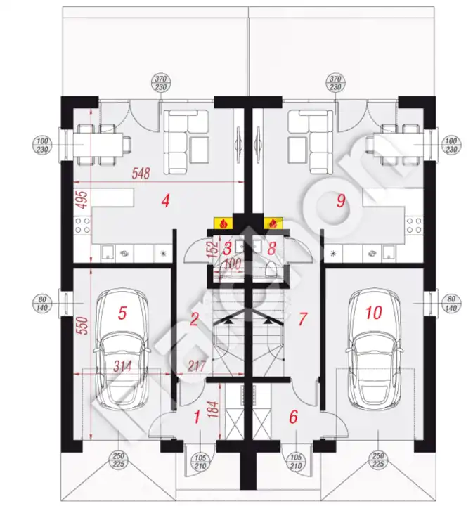 - stan wykończenia budynków – deweloperski (elewacja tynk silikonowo silikatowy, ocieplenie styropianem 15 cm, okna PCV 3 szybowe, parapety zewnętrzne, ściany na parterze i piętrze wykończone tynkiem cementowo- wapiennym, posadzki cementowe, drzwi wejściowe antywłamaniowe, brama garażowa sterowana pilotem)