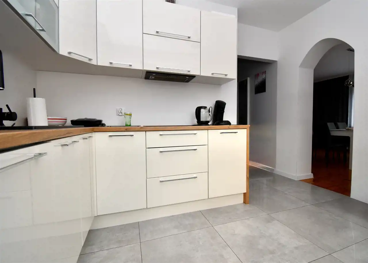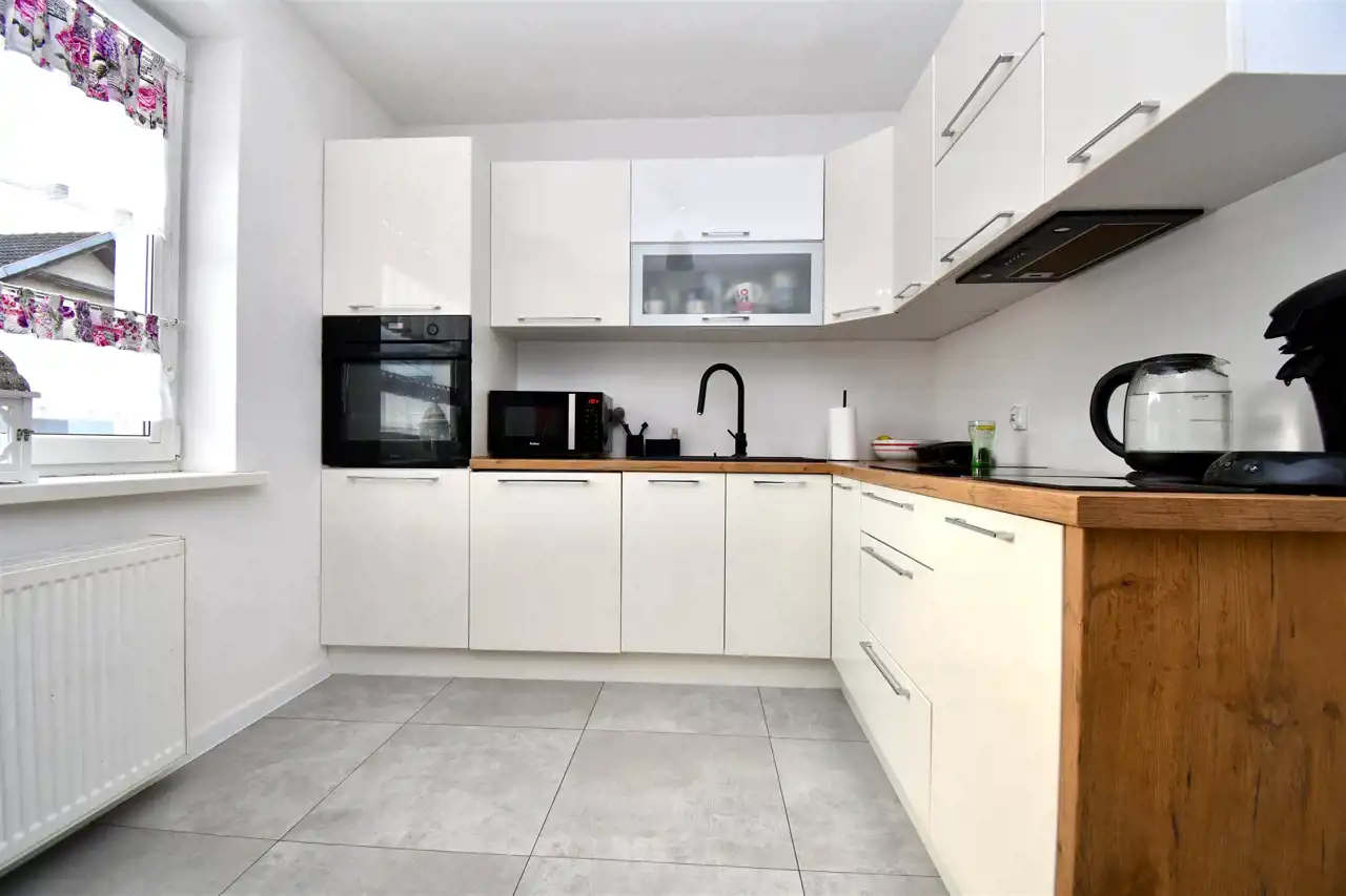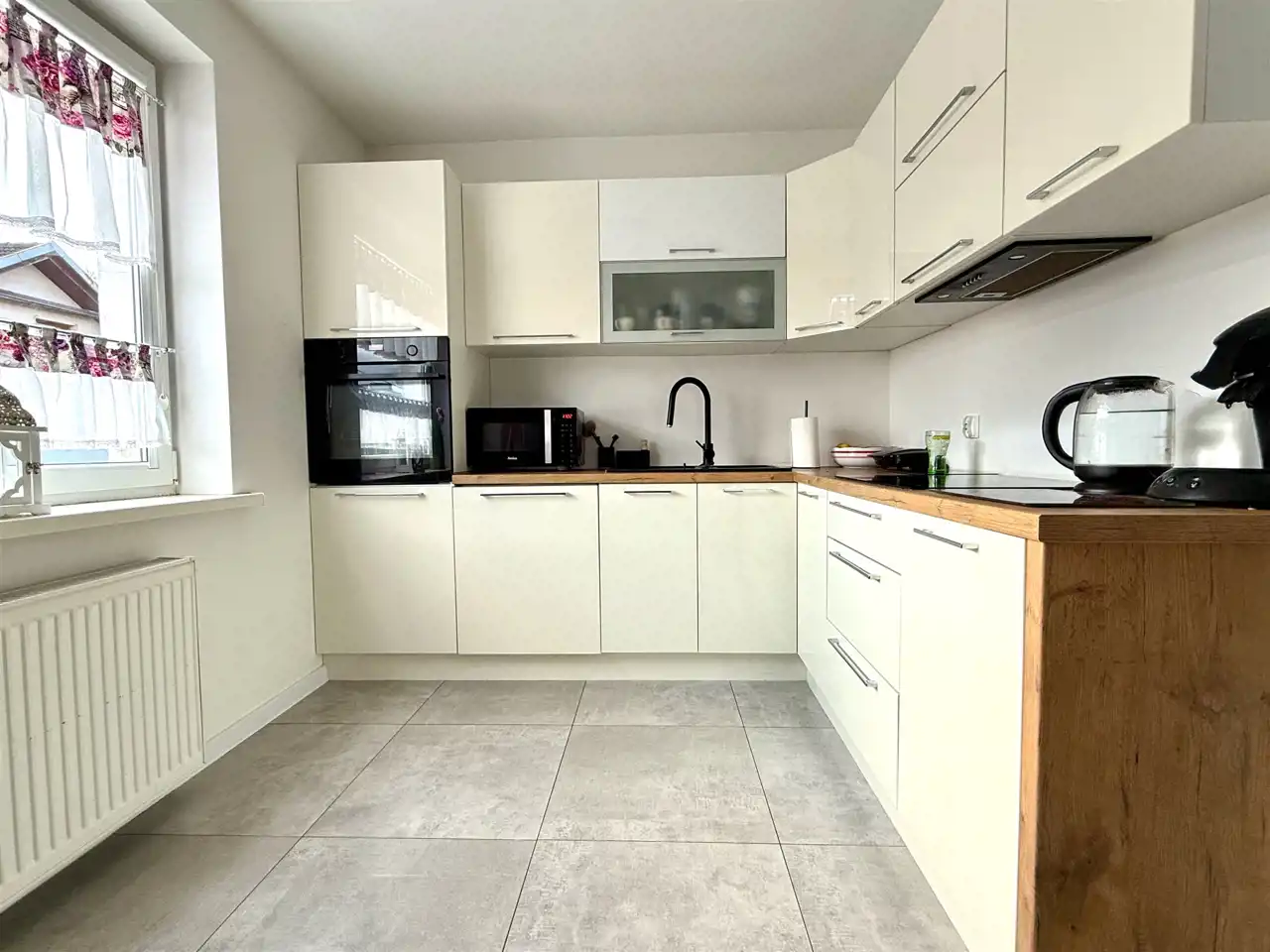 - Parter z dodatkowym osobnym wejściem: przestronny salon z aneksem kuchennym (w cenie zabudowa kuchenna, stół z krzesłami oraz sprzęt AGD), łazienka z WC, kotłownia, pomieszczenia gospodarcze.