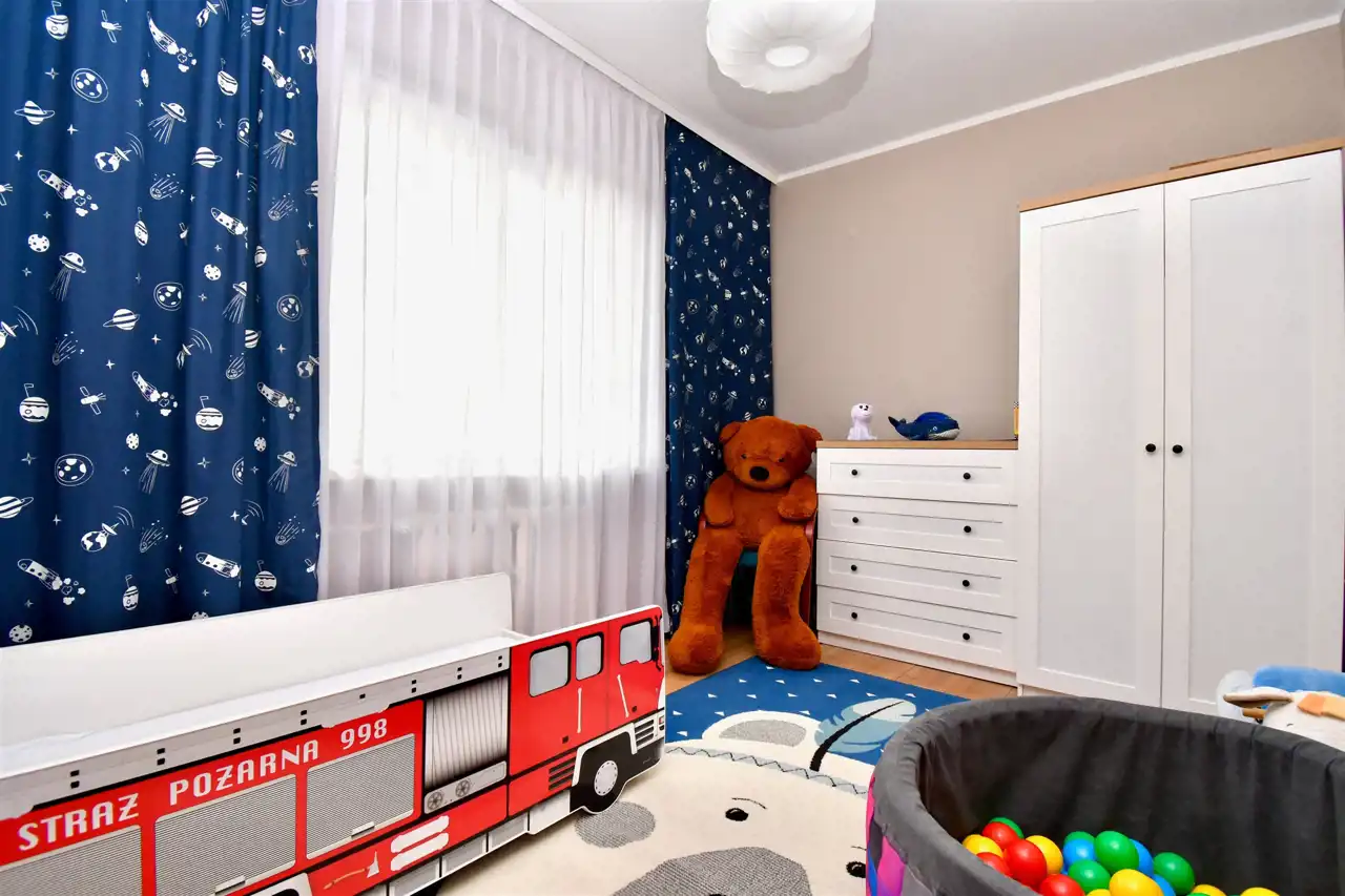 - Piętro II: trzy przytulne pokoje i garderoba, łazienka z WC.