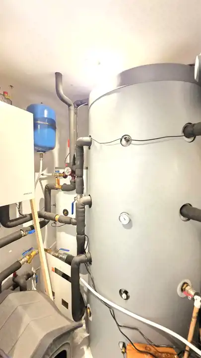 wiatrołap z wnęką, w której zamontowano nowoczesną pompę ciepła,