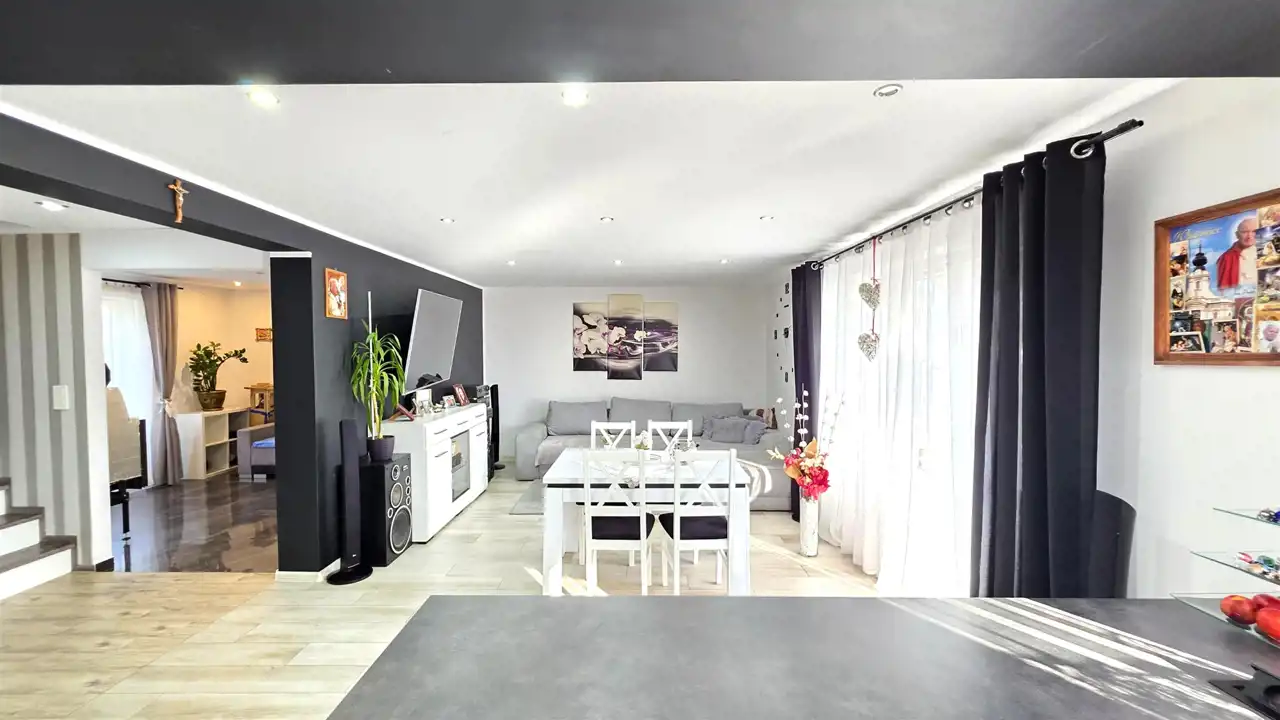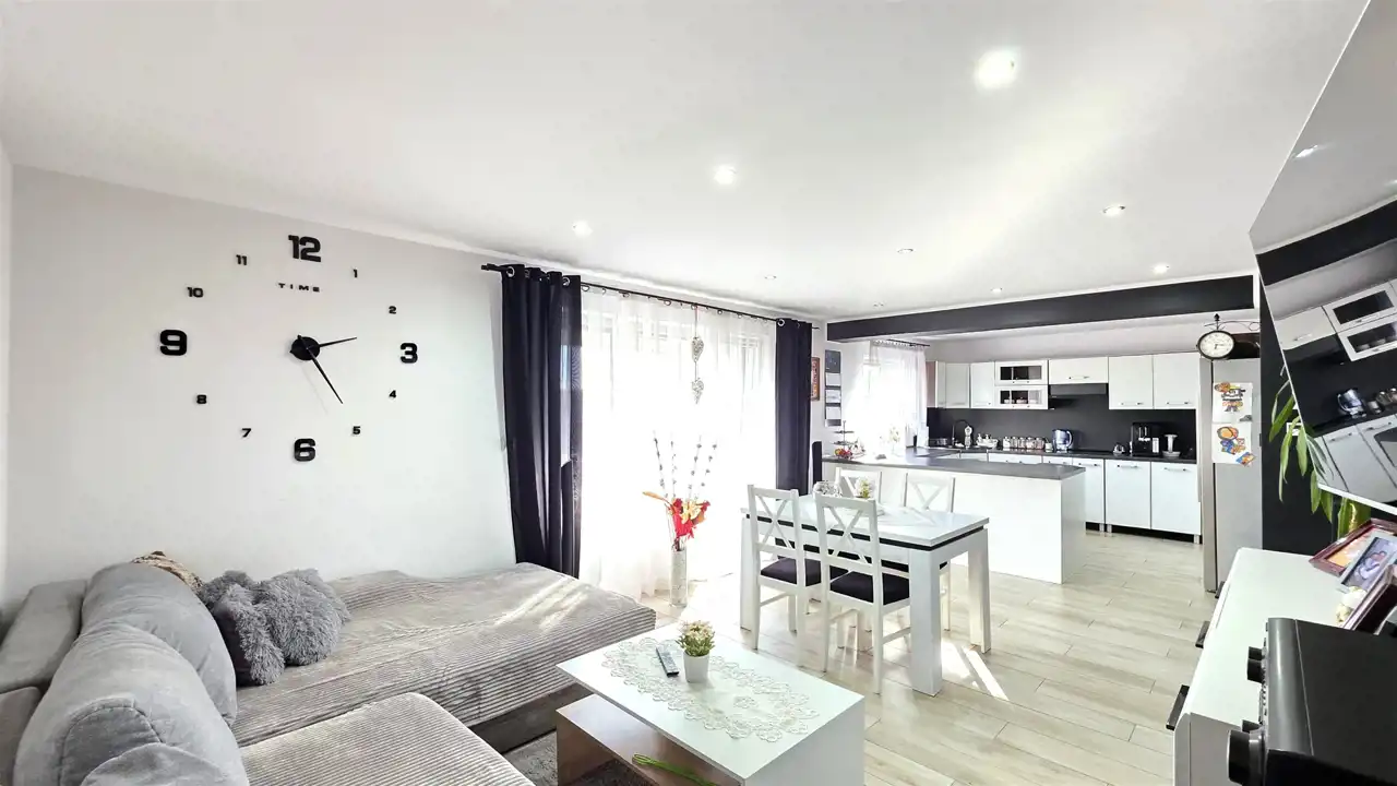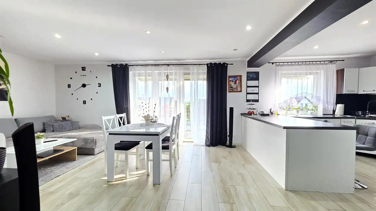 jasny salon z wyjściem na duży taras (ok. 50 m²), połączony z otwartą kuchnią,