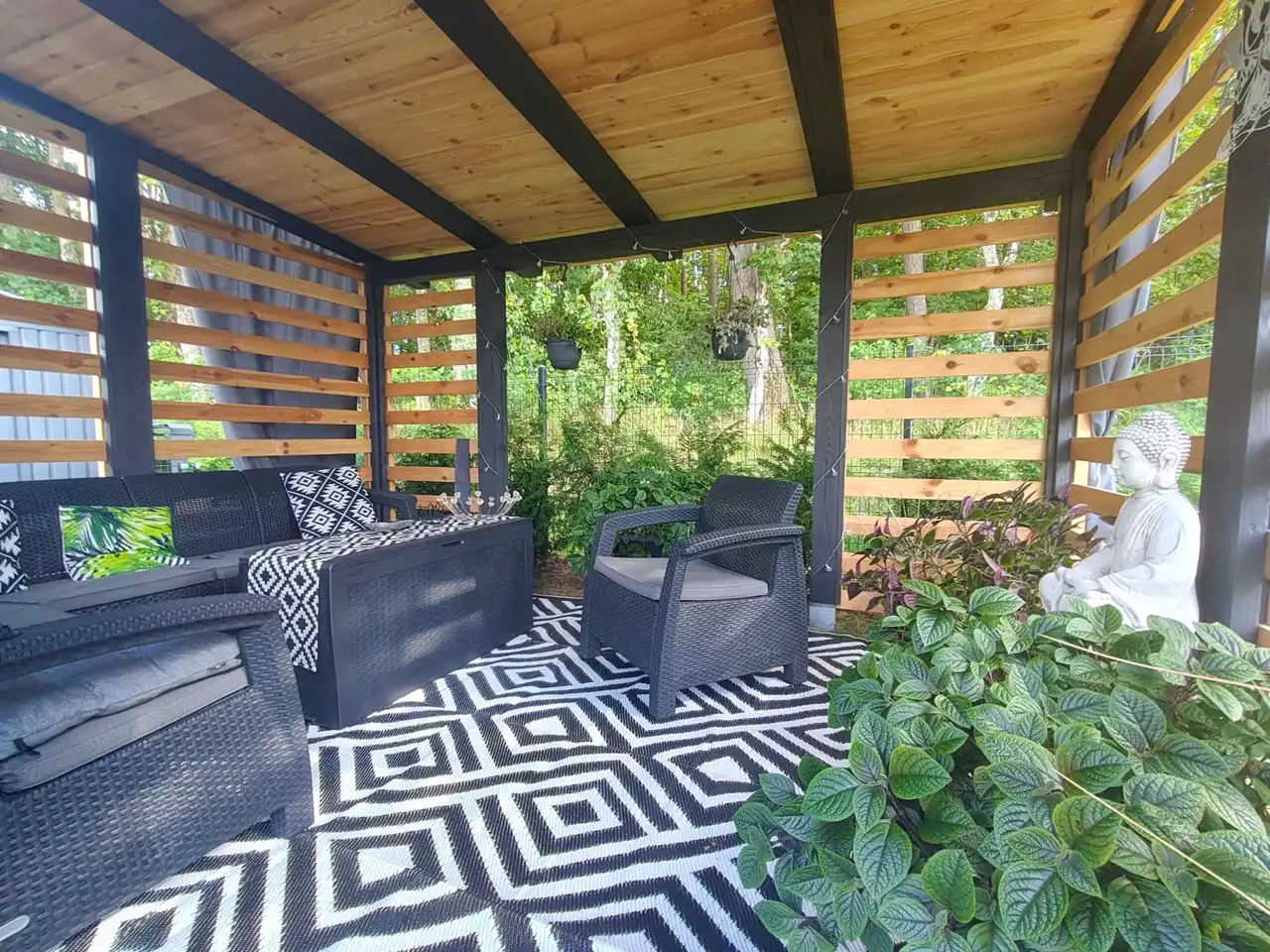 Dodatki: Dwie solidne wiaty ogrodowe, które pełni funkcję dodatkowego miejsca do relaksu i przechowywania..
