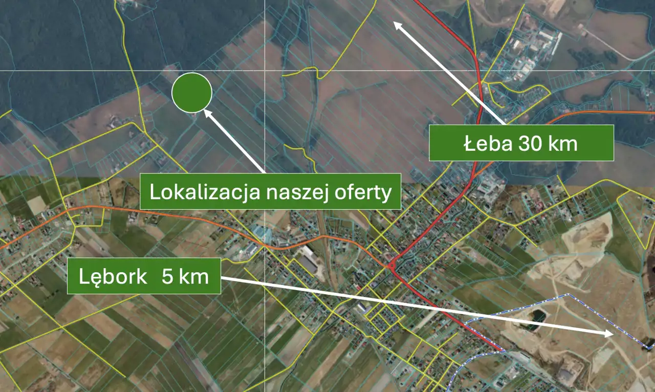 Prezentowane działki zostały wyodrębnione wraz z drogą wewnętrzną w trakcie podziału dużej działki. Podział został wykonany z zamysłem budowy osiedla domów jednorodzinnych z wewnętrzną drogą, która zapewnia bezpośredni dostęp do drogi gminnej. Malownicza okolica i pobliskie lasy sprawiają, że jest to idealne miejsce dla osób chcących zamieszkać z dala od miejskiego zgiełku ale pozostawać w niewielkiej odległości od samego miasta.