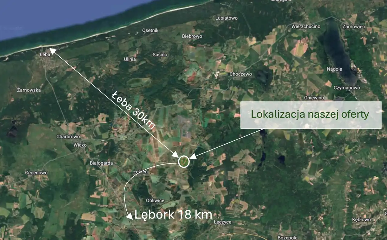 - Lokalizacja: Działka położona jest w Tawęcinie (Gmina Nowa Wieś Lęborska), zaledwie 30 km od Łeby — jednego z najpopularniejszych kurortów na polskim wybrzeżu. Idealne położenie dla osób szukających spokoju z szybkim dostępem do morza i atrakcji Słowińskiego Parku Narodowego.