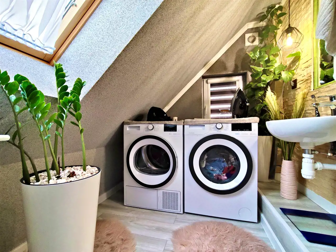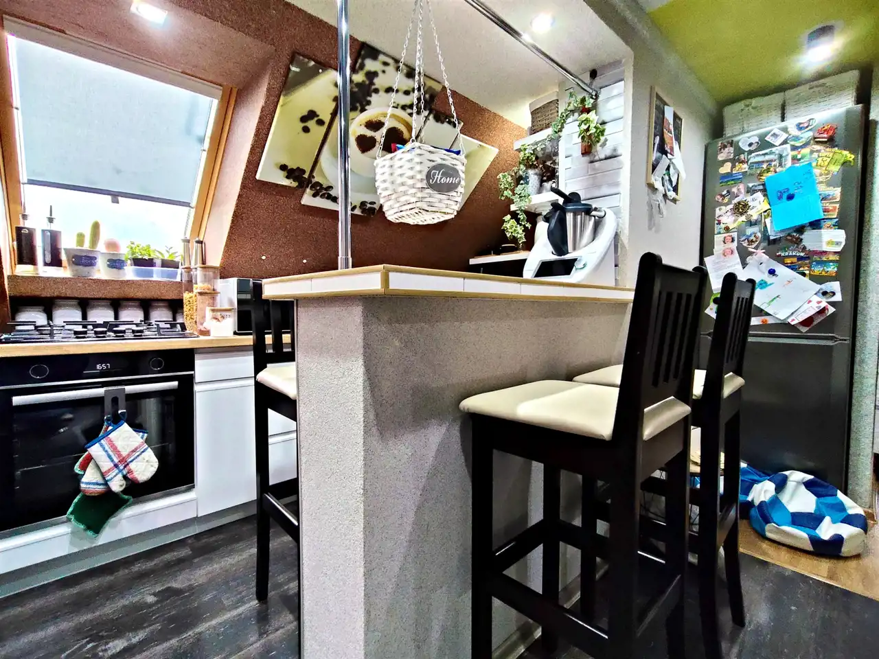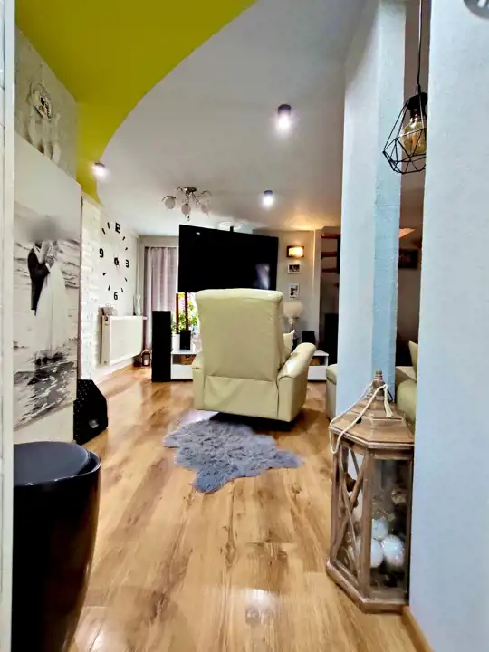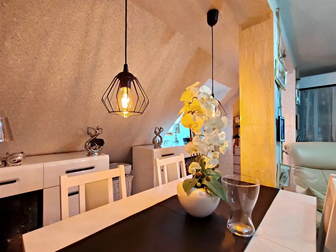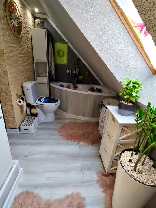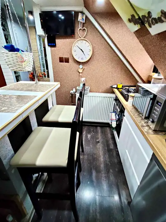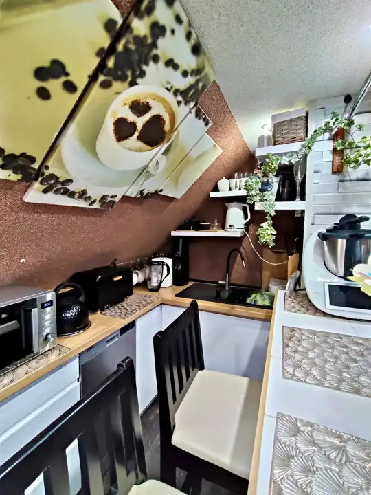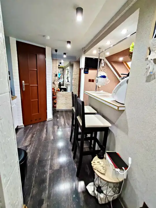 Lokal mieści się w ocieplonym budynku z nowym dachem, posiada unikalny klimat dzięki skosom i przemyślanemu wykończeniu. Każdy centymetr przestrzeni został doskonale zagospodarowany – liczne zabudowy i szafki zwiększają funkcjonalność.