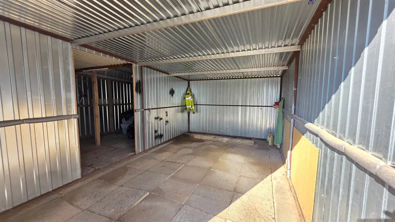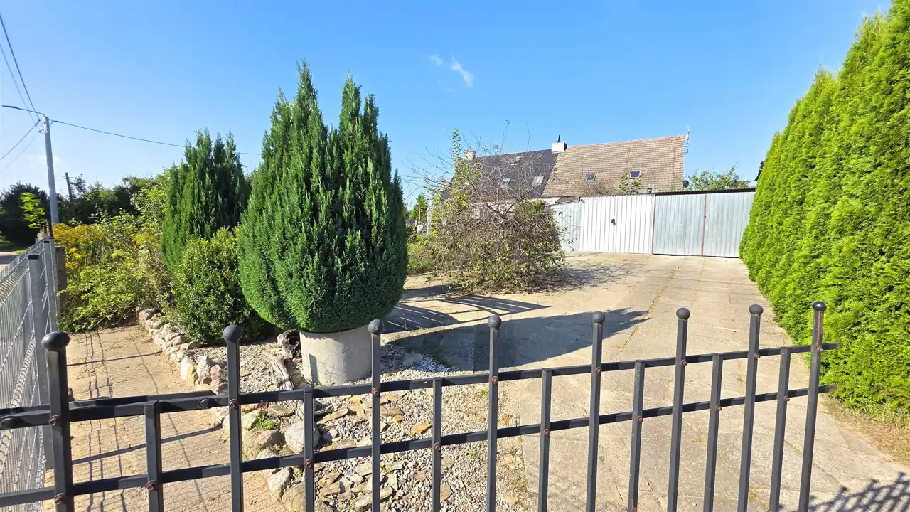 Druga również zagospodarowana działka zlokalizowana przed budynkiem, na której znajduje się blaszak mieszczący dwa samochody